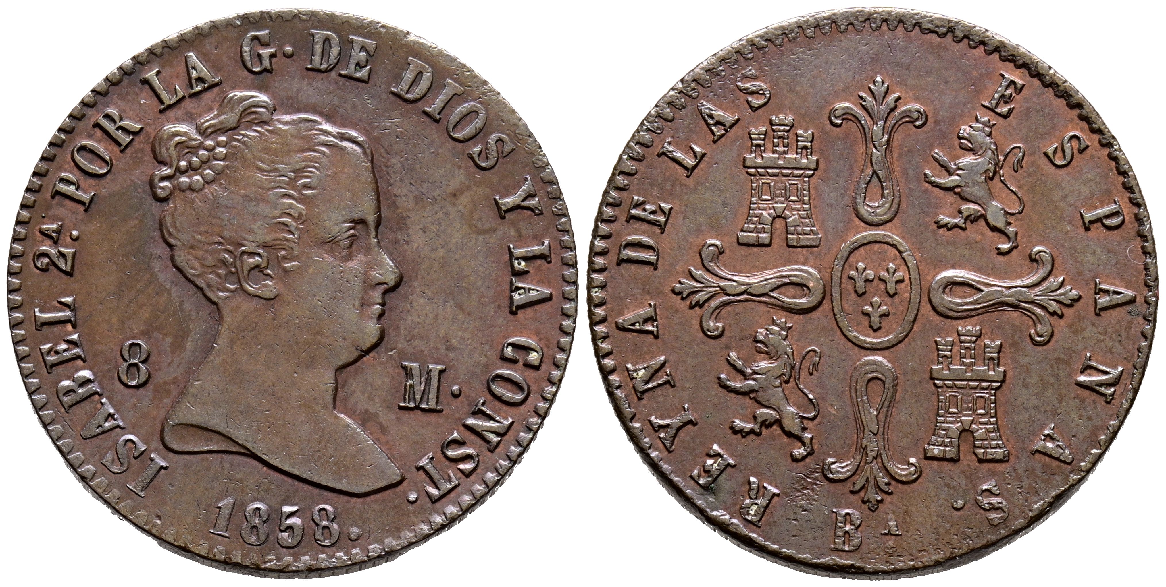 ISABEL II (1833-1868). 8 Maravedís. (Ae. 10,00g /28mm). 1858. Barcelona. (Cal-2019-100). EBC-. Bonito tono.