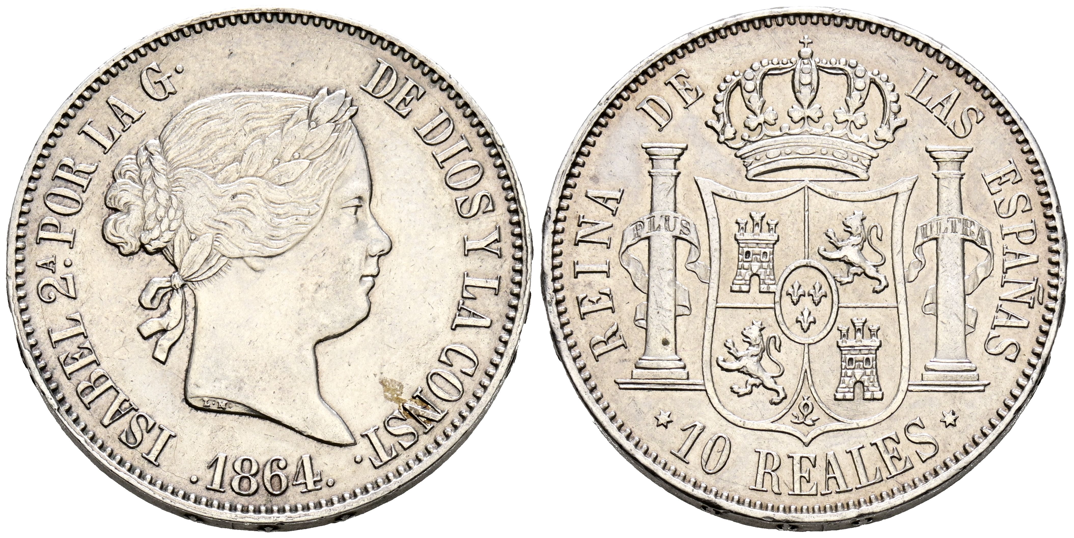 ISABEL II (1833-1868). 10 Reales. (Ar. 12,87g /29mm). 1864. Madrid. (Cal-2019-541). MBC+. Limpiada.