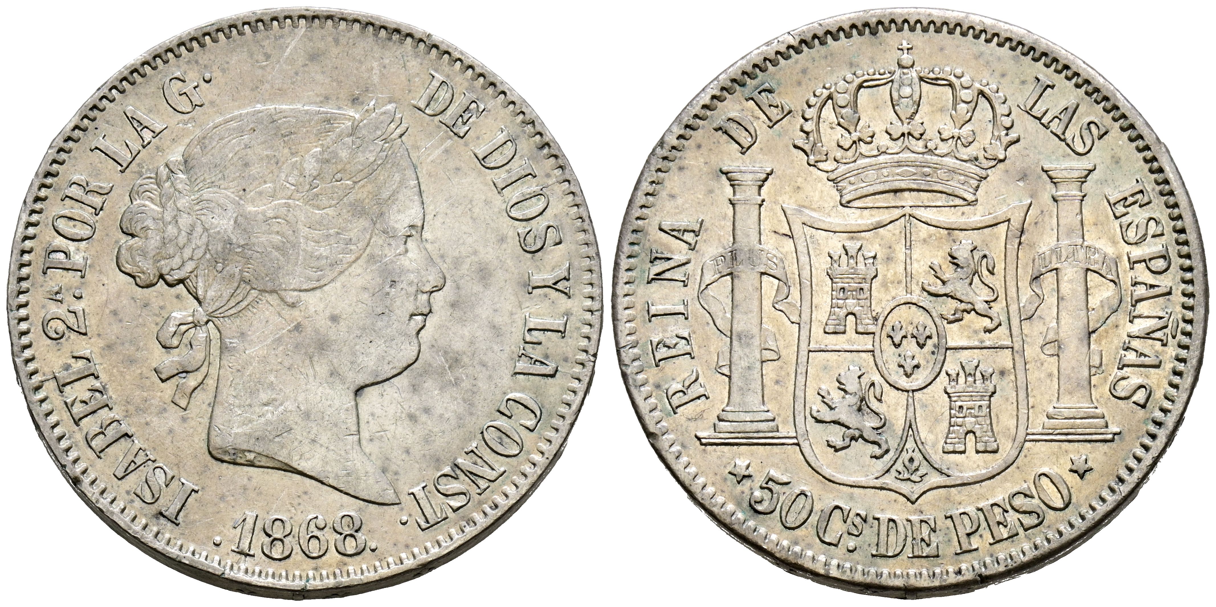 ISABEL II (1833-1868). 50 Centavos de Peso. (Ar. 12,87g/30mm). 1868. Manila. (Cal-2019-667). MBC/MBC+.