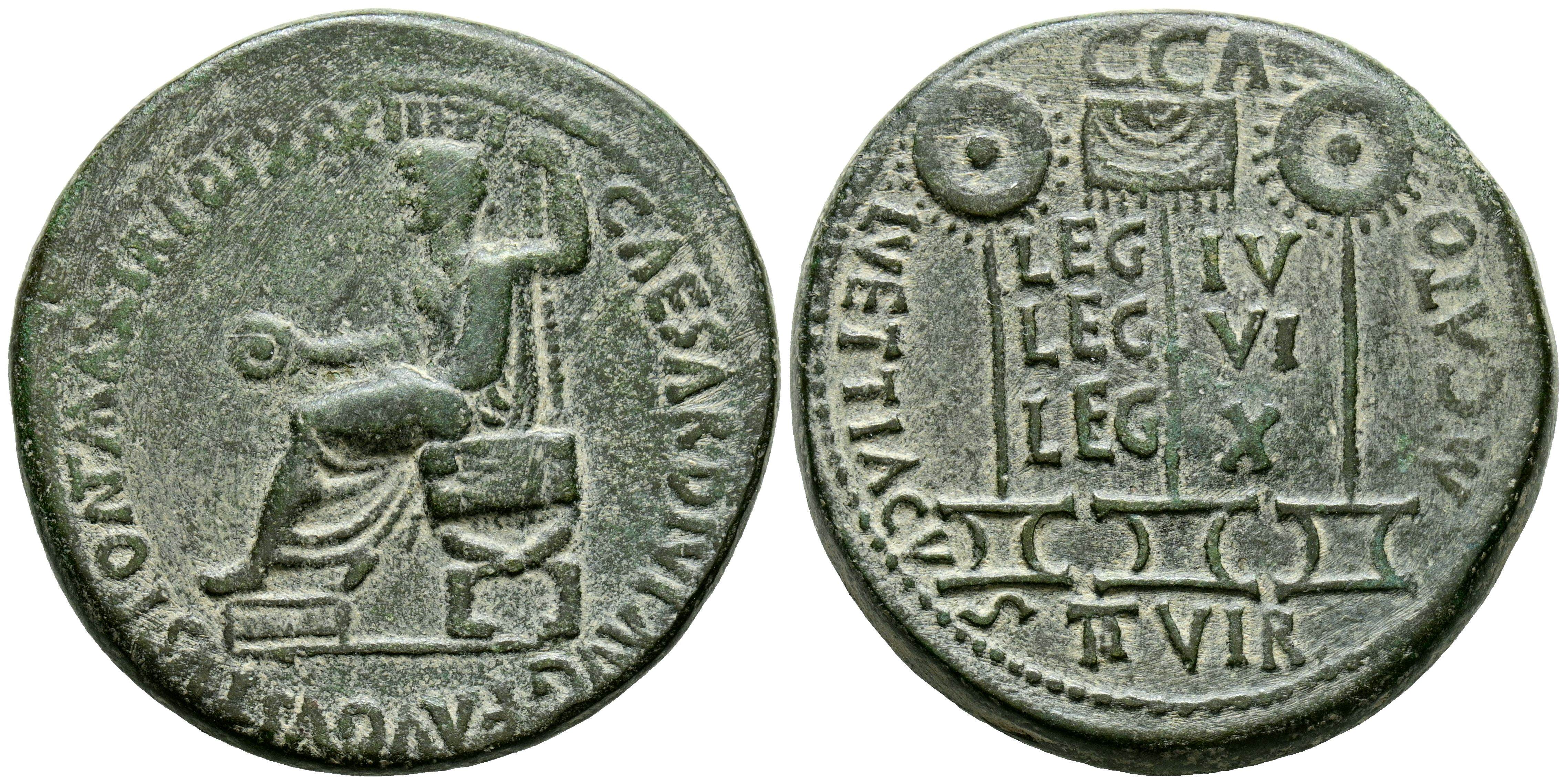 CAESARAUGUSTA (Zaragoza). Dupondio. (Ae. 20,98g/32mm). 14-36 d.C. (FAB-344). Anv: Tiberio sentado a izquierda sobre silla curull portando patera y cetro, alrededor leyenda: TI CAESAR DIVI AVG F AVGVSTVS PONT MAX TR POT XXXIII. Rev: Estandarte entre dos enseñas, entre ellos leyenda: LEG-IV/LEG-VI/LEGX, alrededor leyenda: C CAL VETTIACVS M CATO II VIR. MBC. Repasado y repatinado.