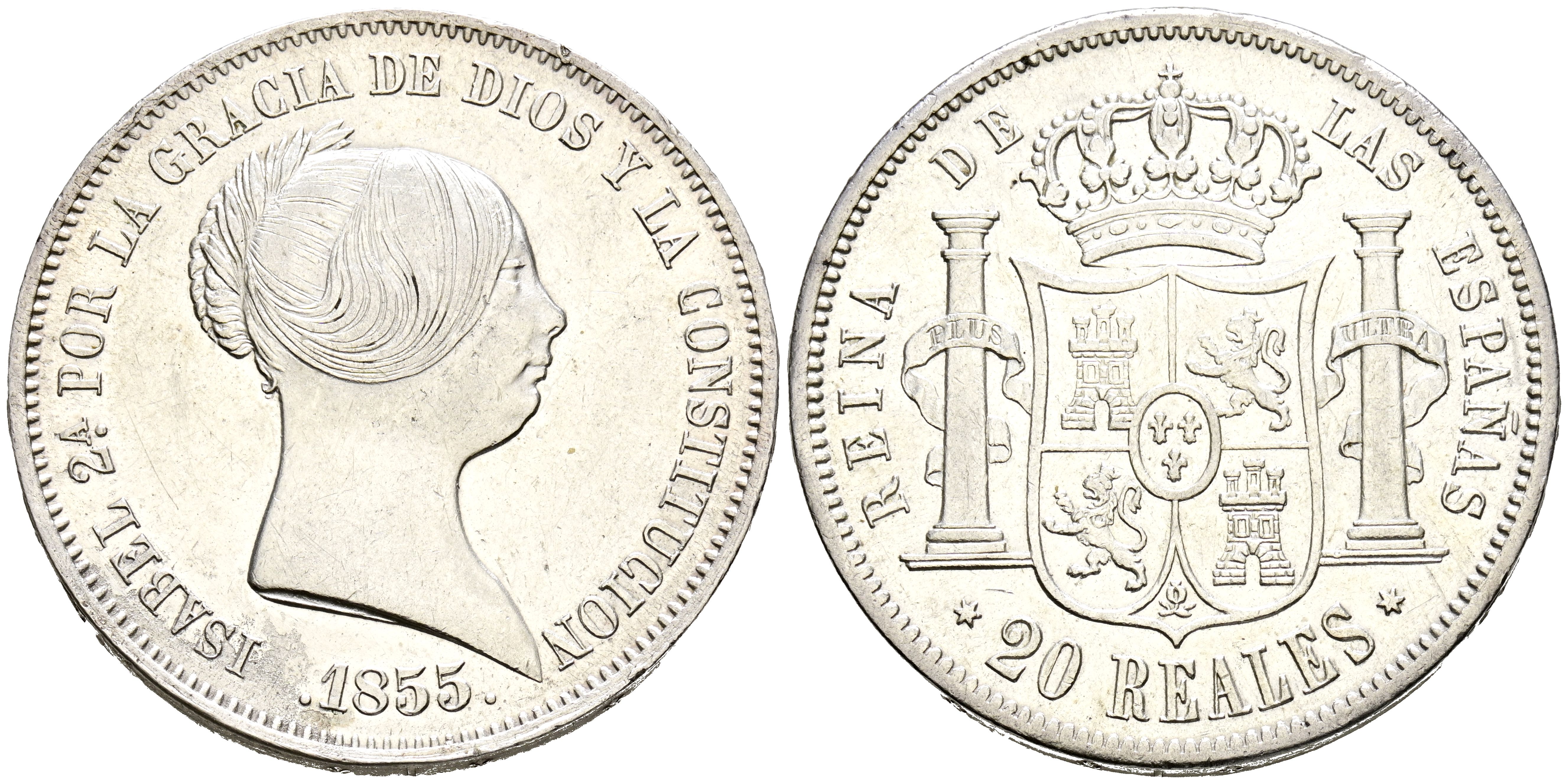 ISABEL II (1833-1868). 20 Reales. (Ar. 26,02g/37mm). 1855. Madrid. (Cal-2019-597). EBC-. Rayitas.