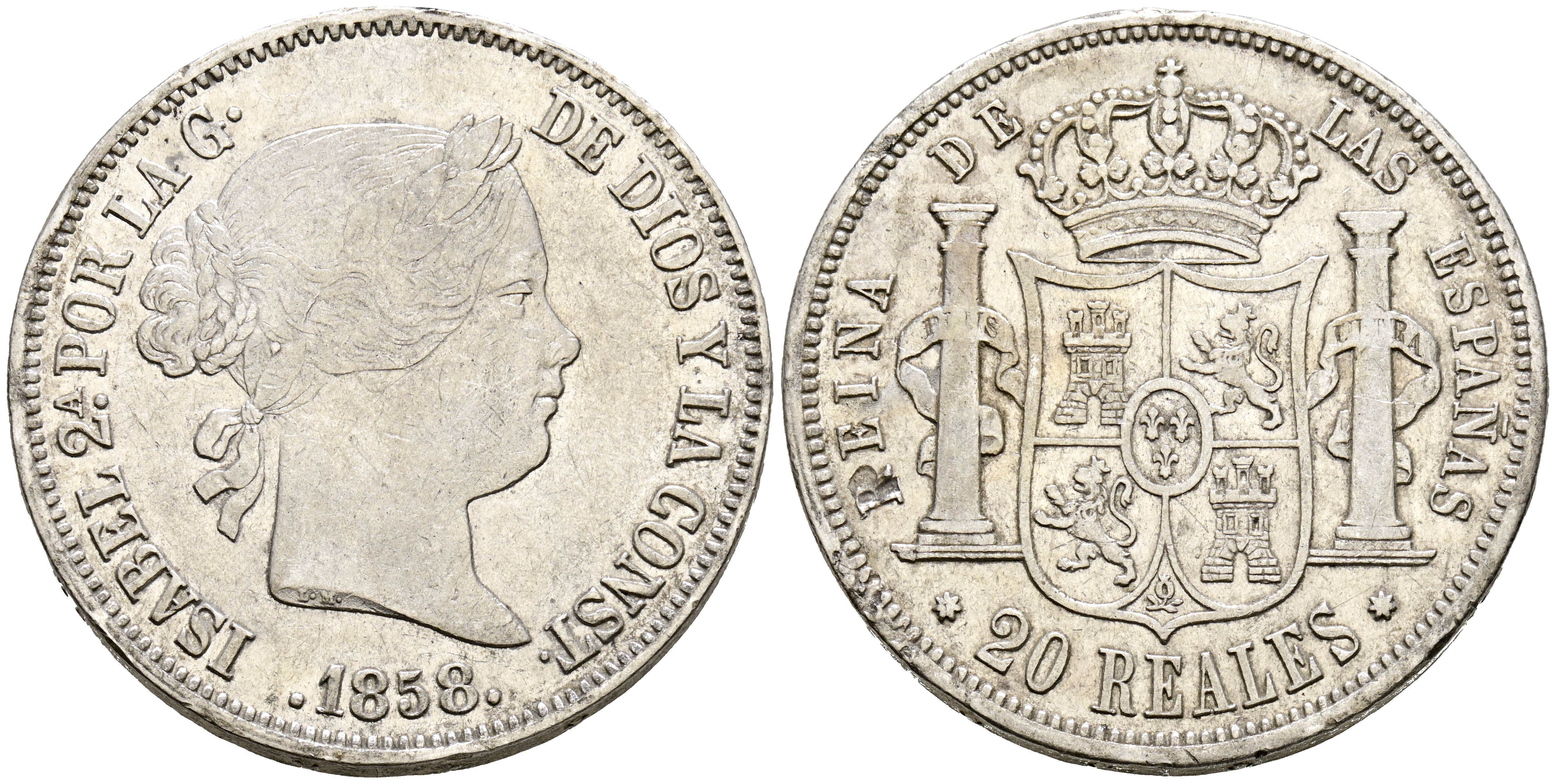ISABEL II (1833-1868). 20 Reales. (Ar. 25,76g/37mm). 1858. Sevilla. (Cal-2019-634). MBC+. Hojita saltada en reverso. Escasa.