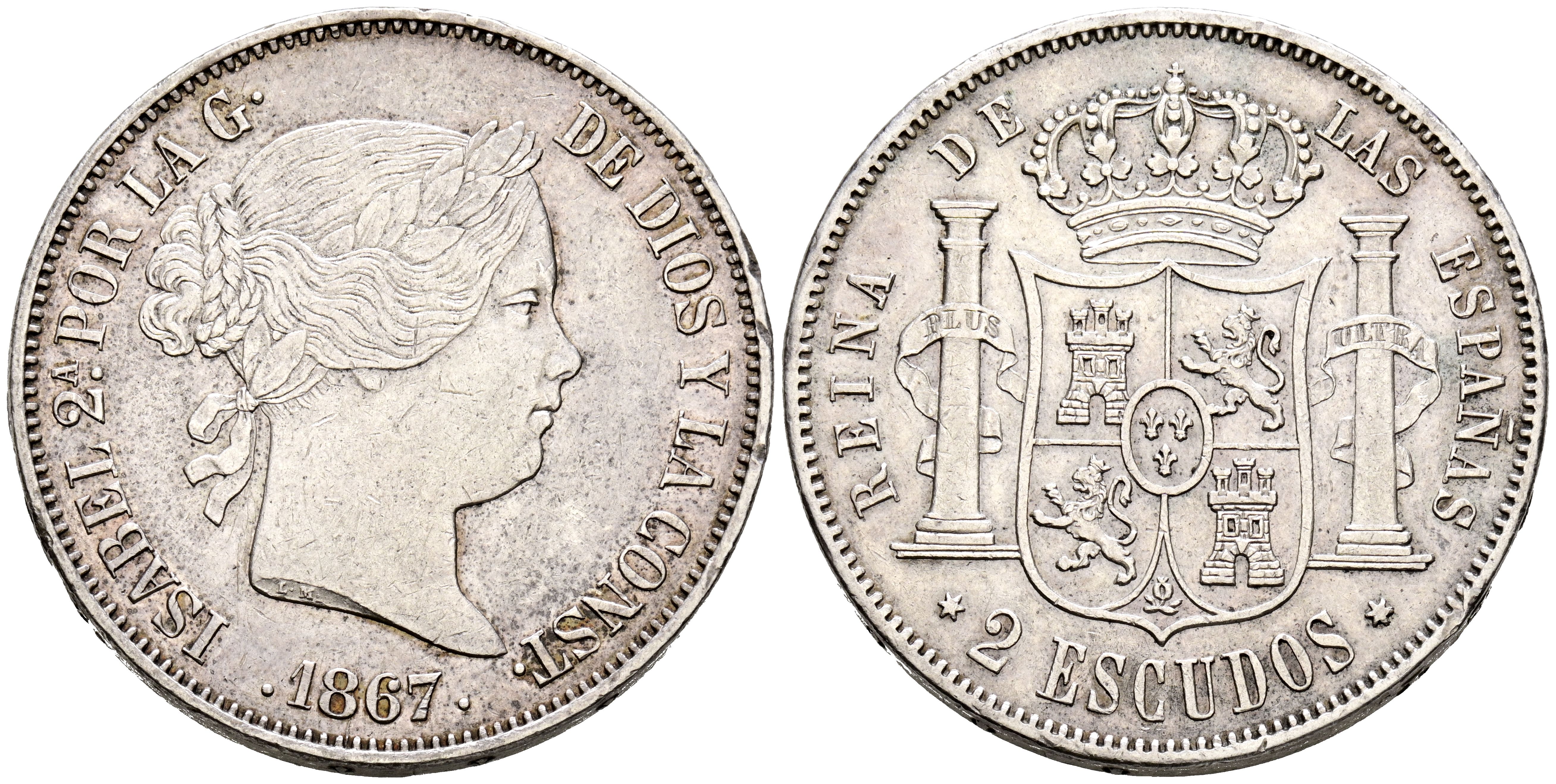 ISABEL II (1833-1868). 2 Escudos. (Ar. 25,93g/37mm). 1867. Madrid. (Cal-2019-647). MBC+.