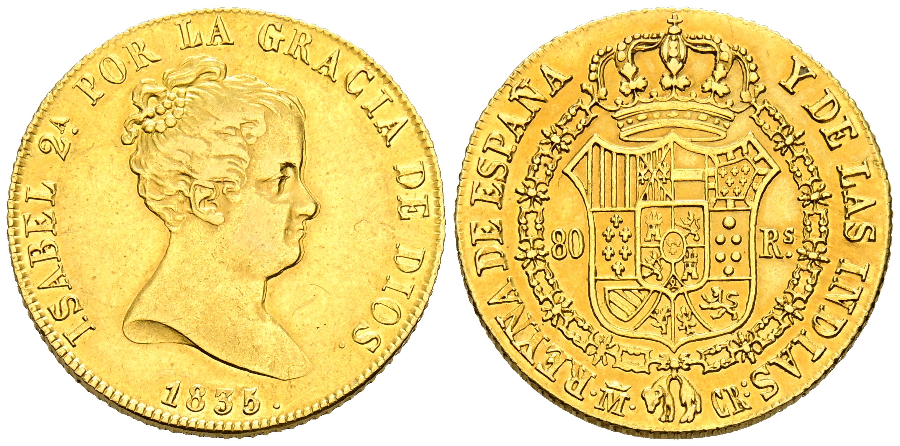 ISABEL II (1833-1868). 80 Reales. (Au. 6,77g /21mm). 1835. Madrid CR. (Cal-2019-720). EBC-/EBC.