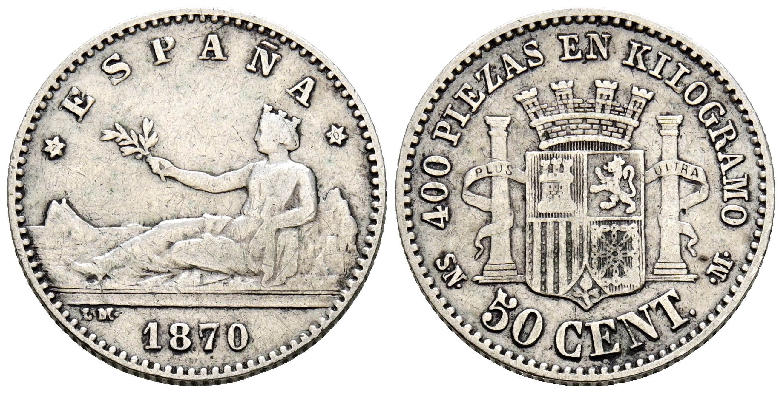 GOBIERNO PROVISIONAL (1868-1871). 50 Céntimos (Ar. 2,38g/18mm). 1870 *7-0. Madrid SNM. (Cal-2019-15). MBC-.