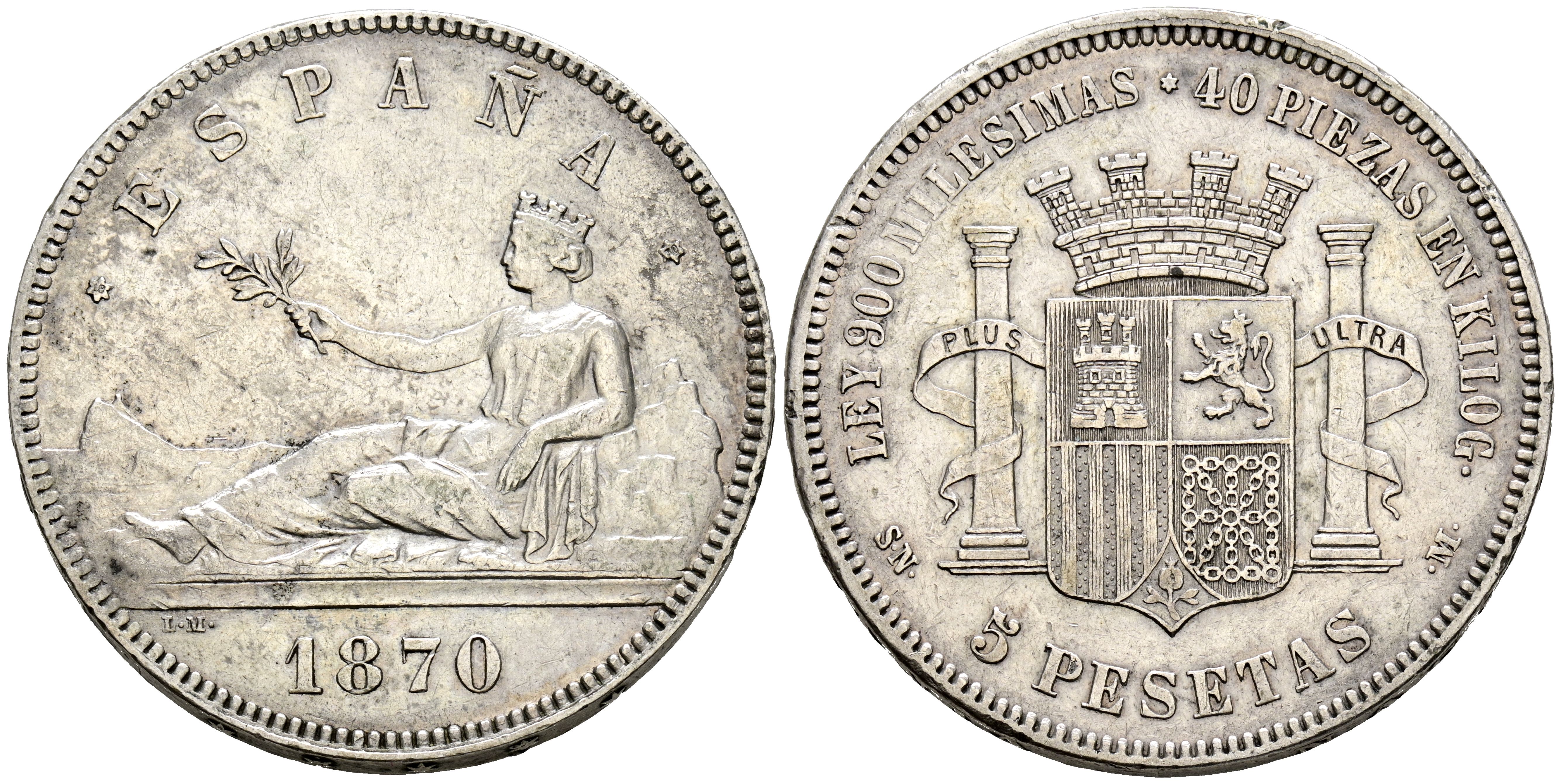GOBIERNO PROVISIONAL (1868-1871). 5 Pesetas. (Ar. 25,04g / 37mm). 1870 *18-70. Madrid SNM. (Cal-2019-39). MBC.
