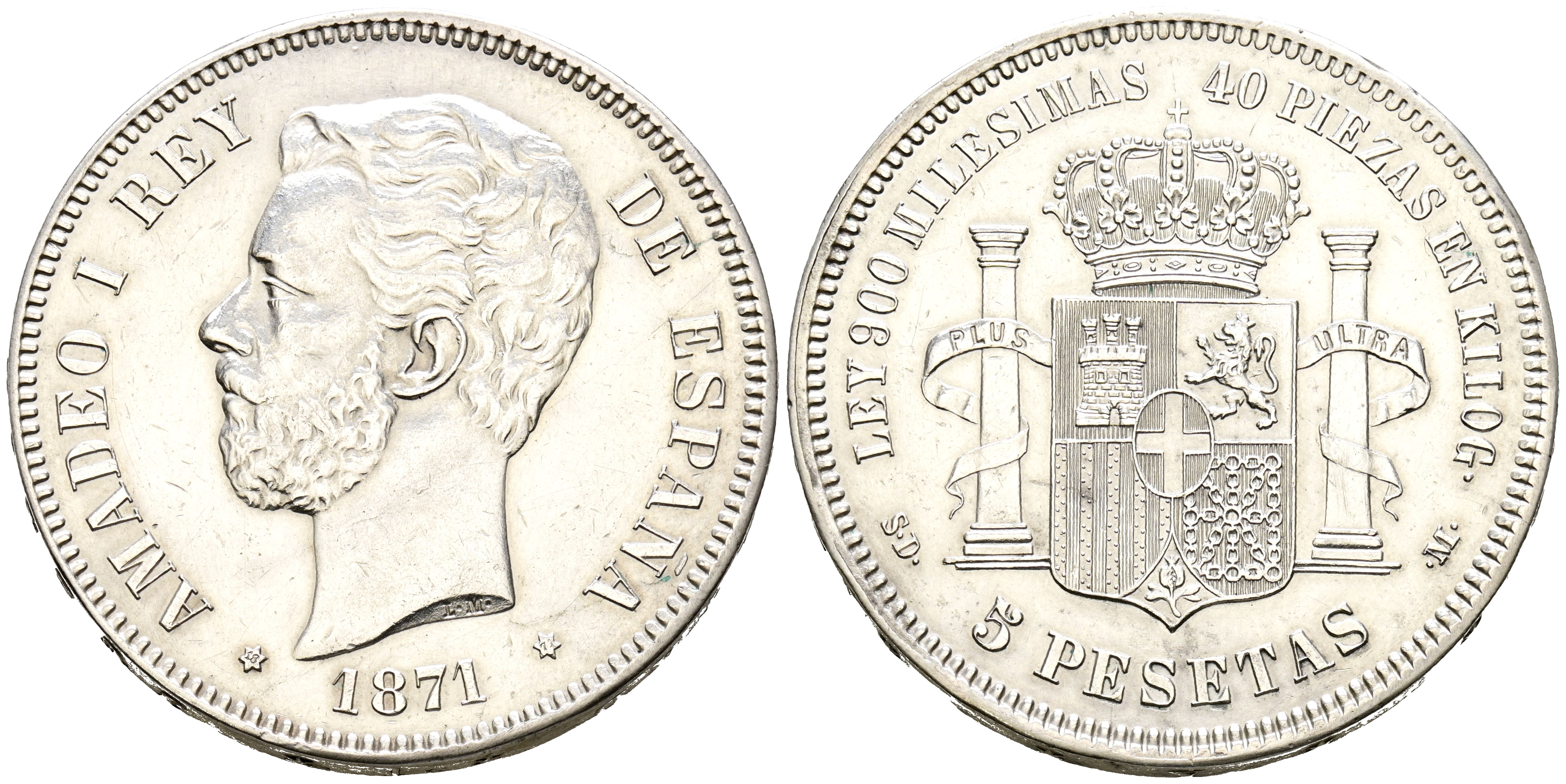 AMADEO I (1871-1873). 5 Pesetas. (Ar. 24,91g/37mm). 1871 *18-71. Madrid SDM. (Cal-2019-1). EBC-. Limpiada.