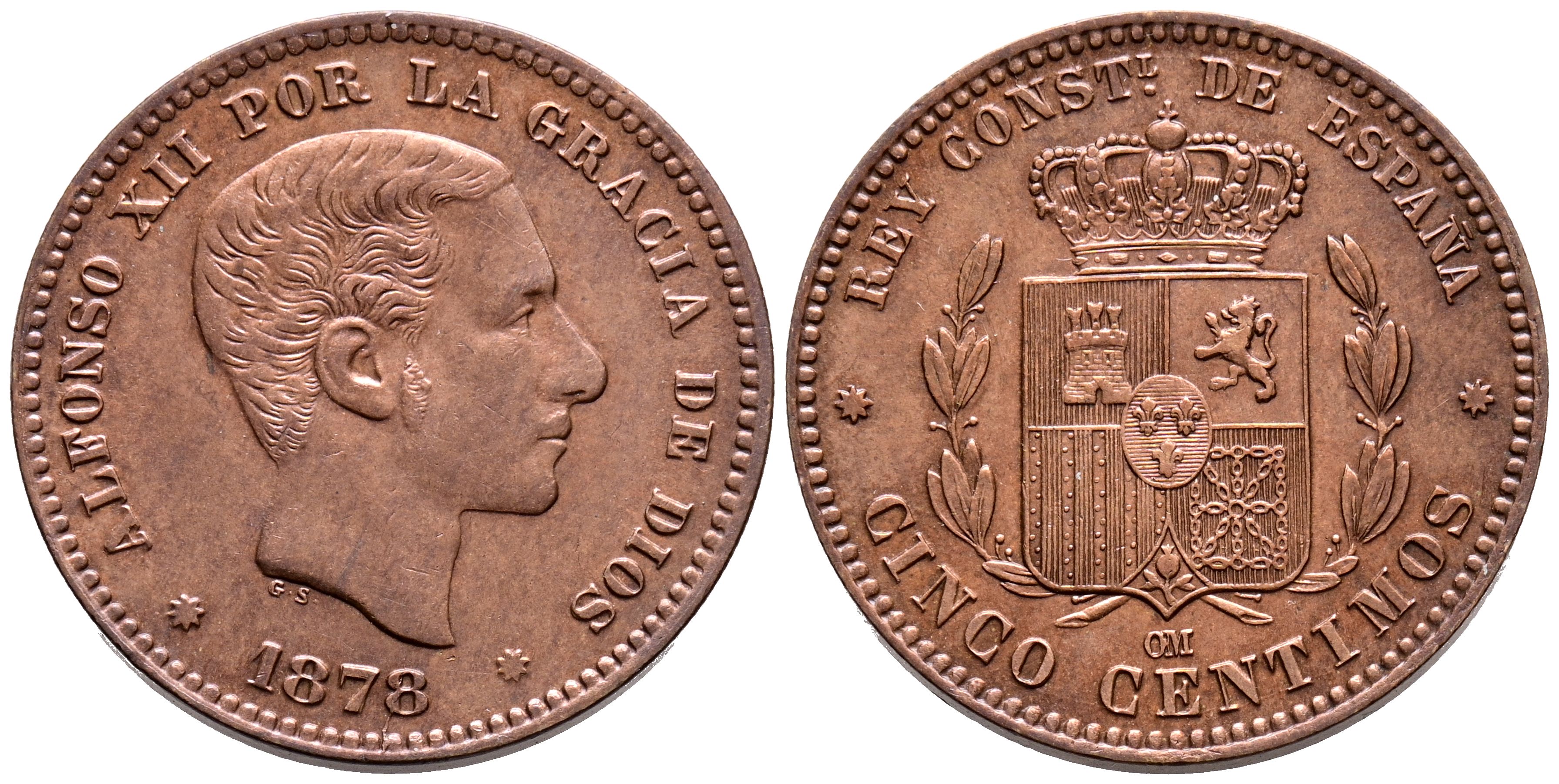 ALFONSO XII (1874-1885). 5 Céntimos. (Ae. 5,16g/24mm). 1878. Barcelona OM. (Cal-2019-5). EBC+. Restos de brillo original.