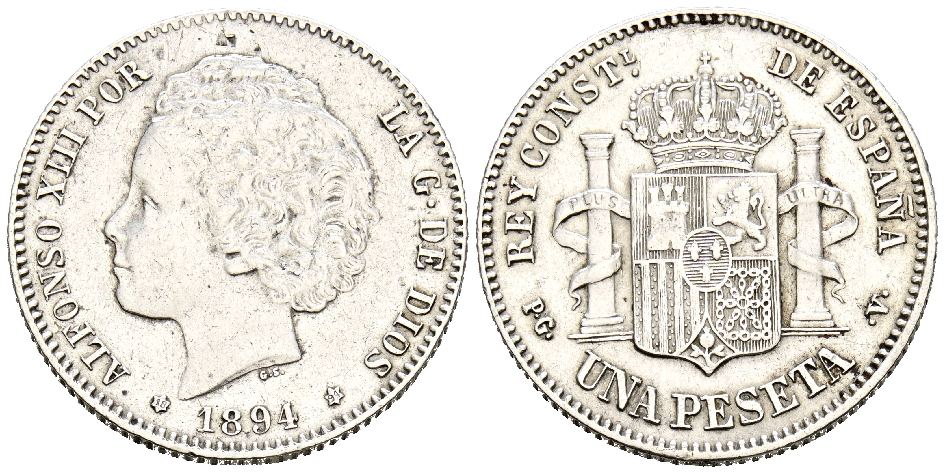 ALFONSO XIII (1885-1931). 1 Peseta. (Ar. 5,00g/23mm). 1894 *18-94. Madrid PGV. (Cal-2019-55). MBC+/MBC. Estrellas perfectamente visibles. Limpiada.