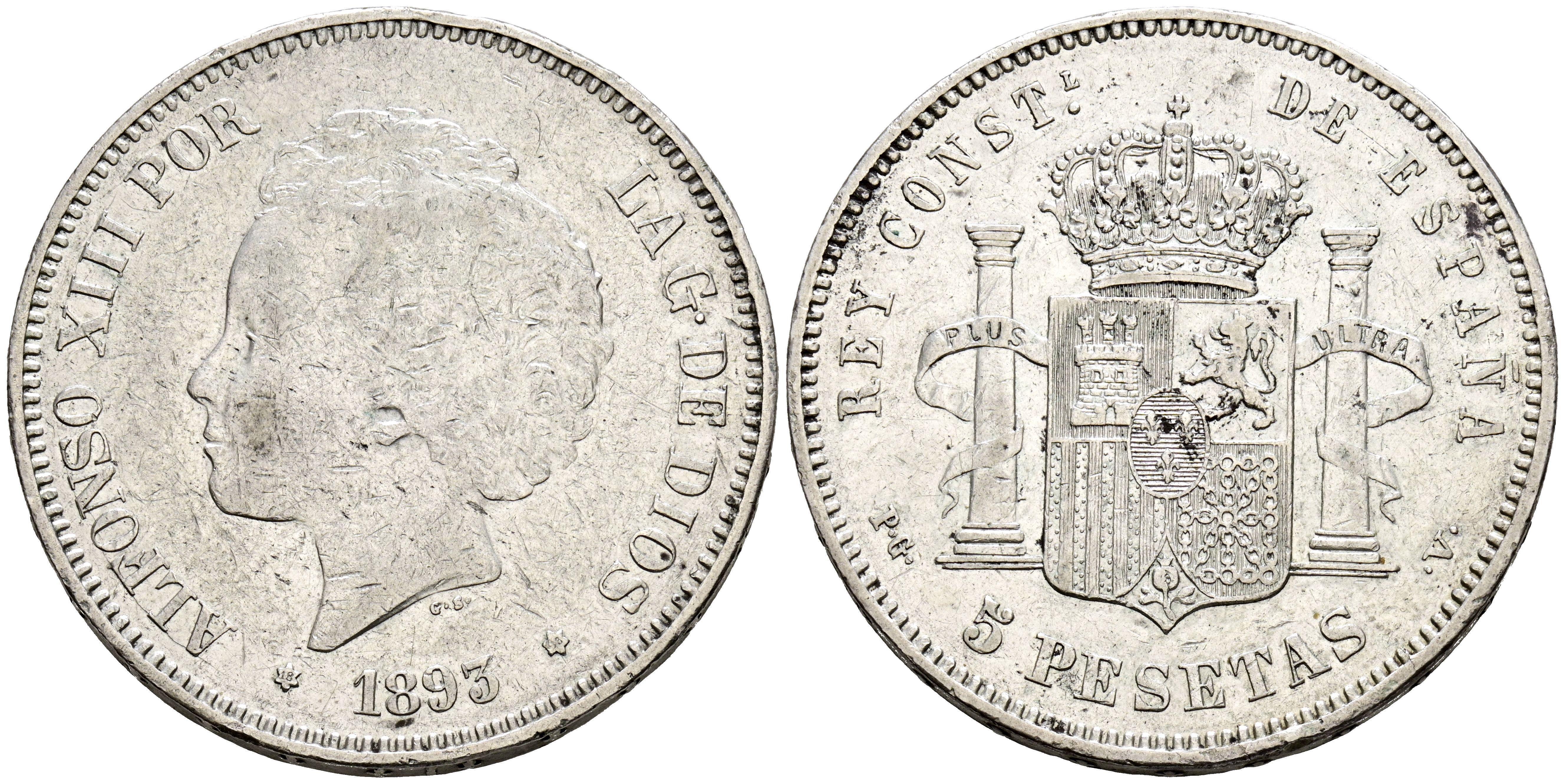 ALFONSO XIII (1885-1931). 5 Pesetas. (Ar. 24,,96g/37mm). 1893 *18-93. Madrid PGV. (Cal-2019-103). MBC.