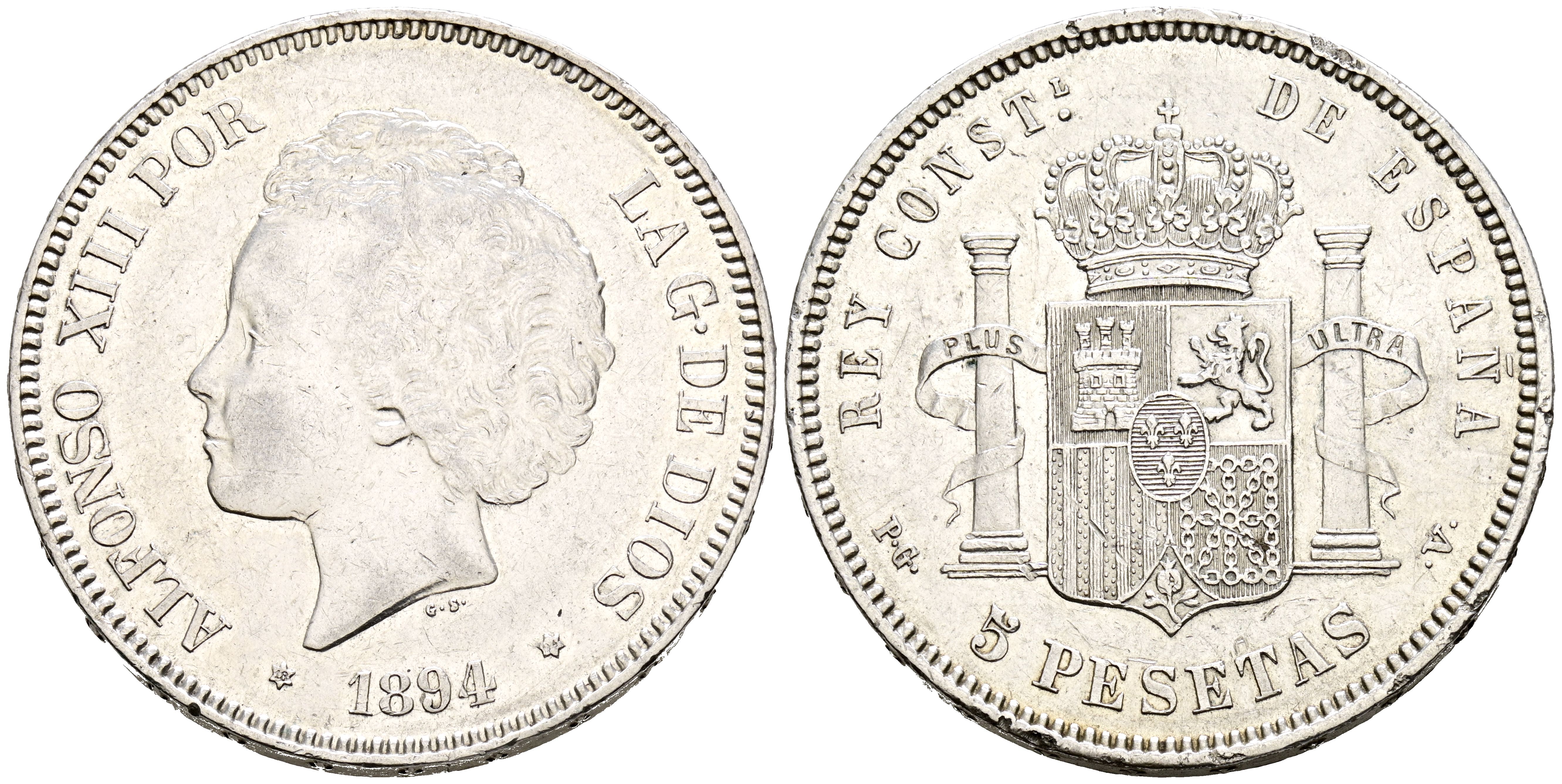 ALFONSO XIII (1885-1931). 5 pesetas. (Ar. 24,93g/37mm). 1894 *18-94. Madrid PGV. (Cal-2019-104). MBC+. Marquitas.