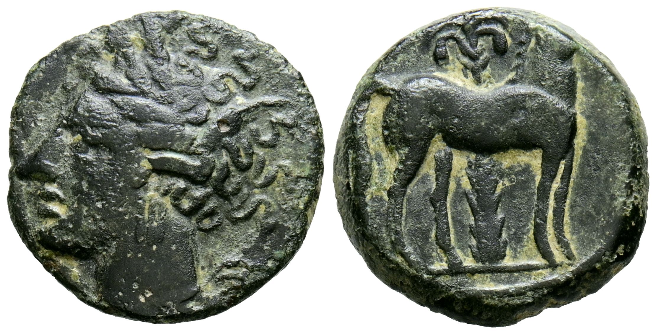 CARTAGONOVA (Cartagena, Murcia). 1/2 Calco. (Ae. 2,66g/15mm). 220-215 a.C. (FAB-507). Anv: Cabeza de Tanit a izquierda. Rev: Caballo parado a derecha, detrás palmera. MBC.