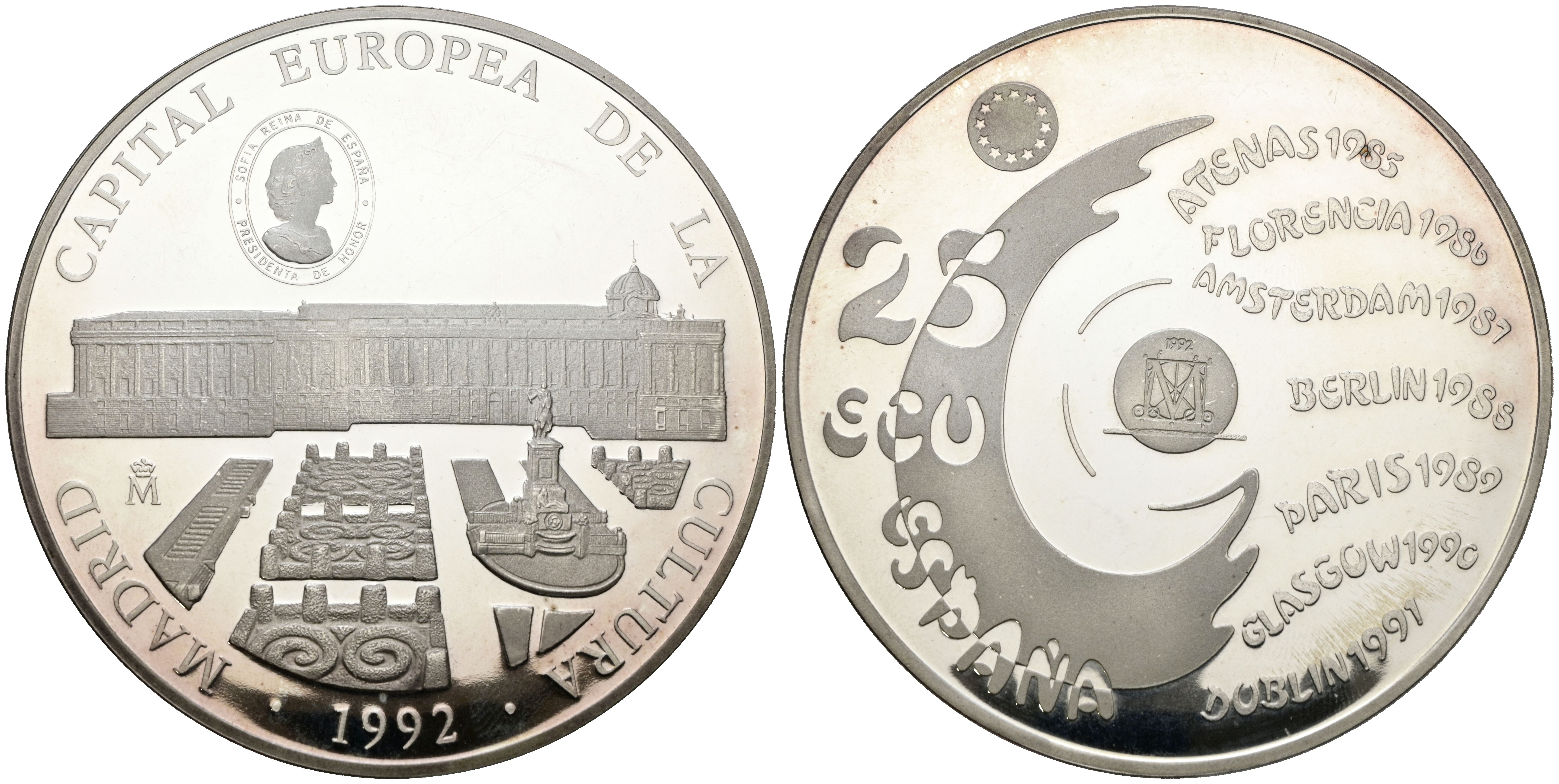 JUAN CARLOS I (1975-2014). 25 Ecu (Ar. 168,44g/73mm). Madrid Capital Europea de la Cultura. 1992. FNMT. FDC. Leves marquitas. Tirada de 15.000 unidades.