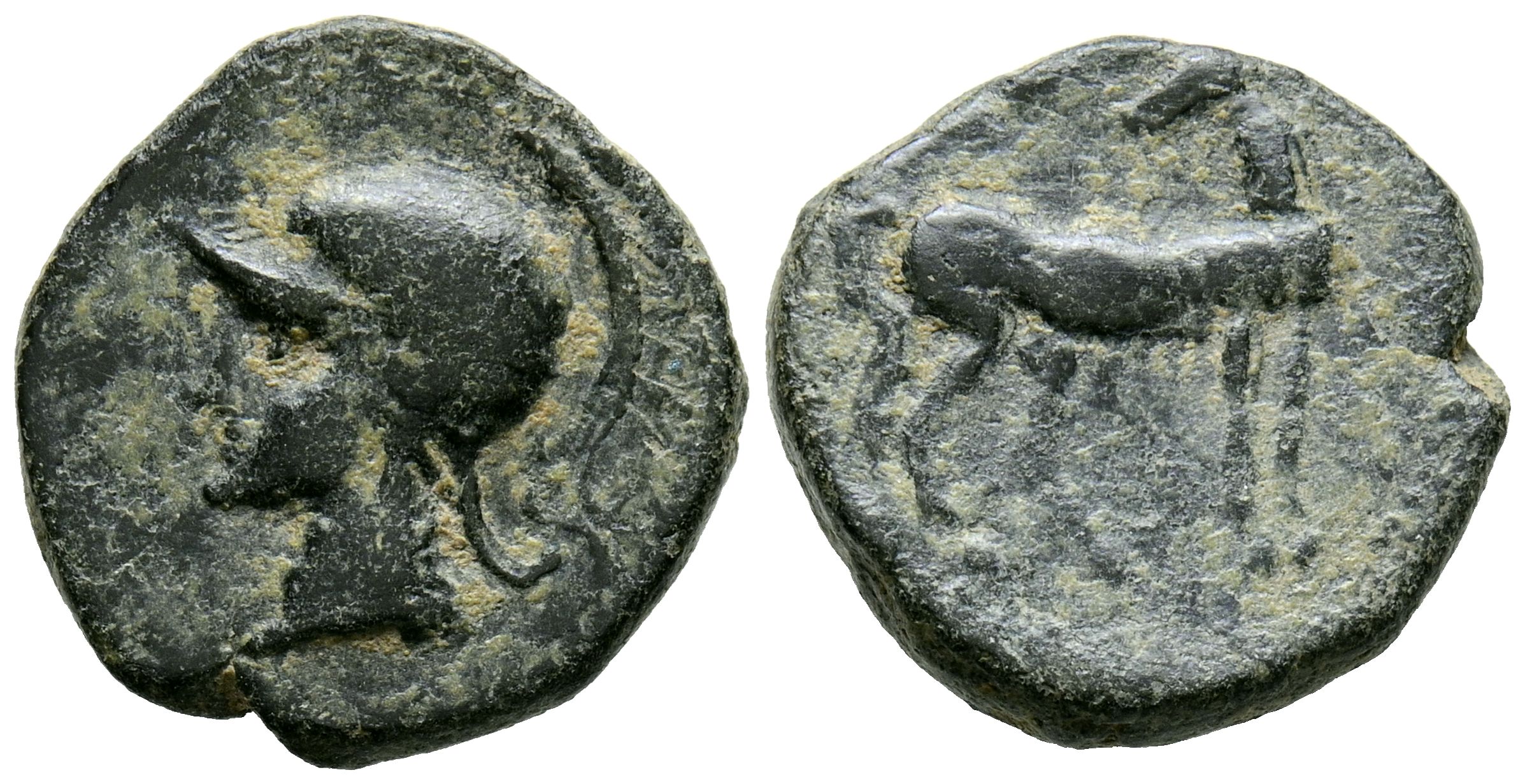 CARTAGONOVA (Cartagena, Murcia). 1/2 Calco. (Ae. 3,57g/16mm). 220-215 a.C. (FAB-517). Anv: Cabeza de Ares con casco a izquierda. Rev: Caballo estante a derecha mirando a izquierda. MBC.