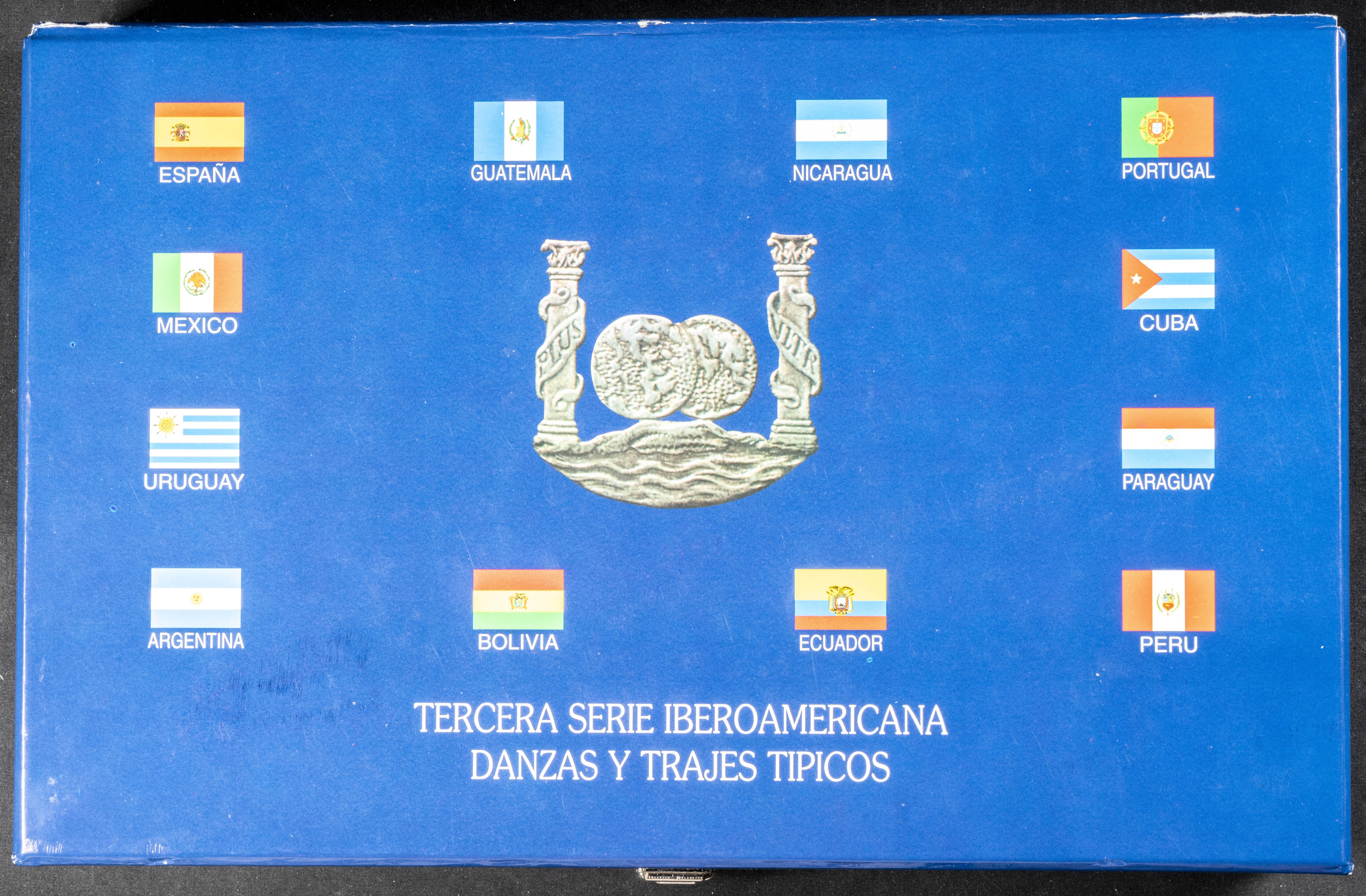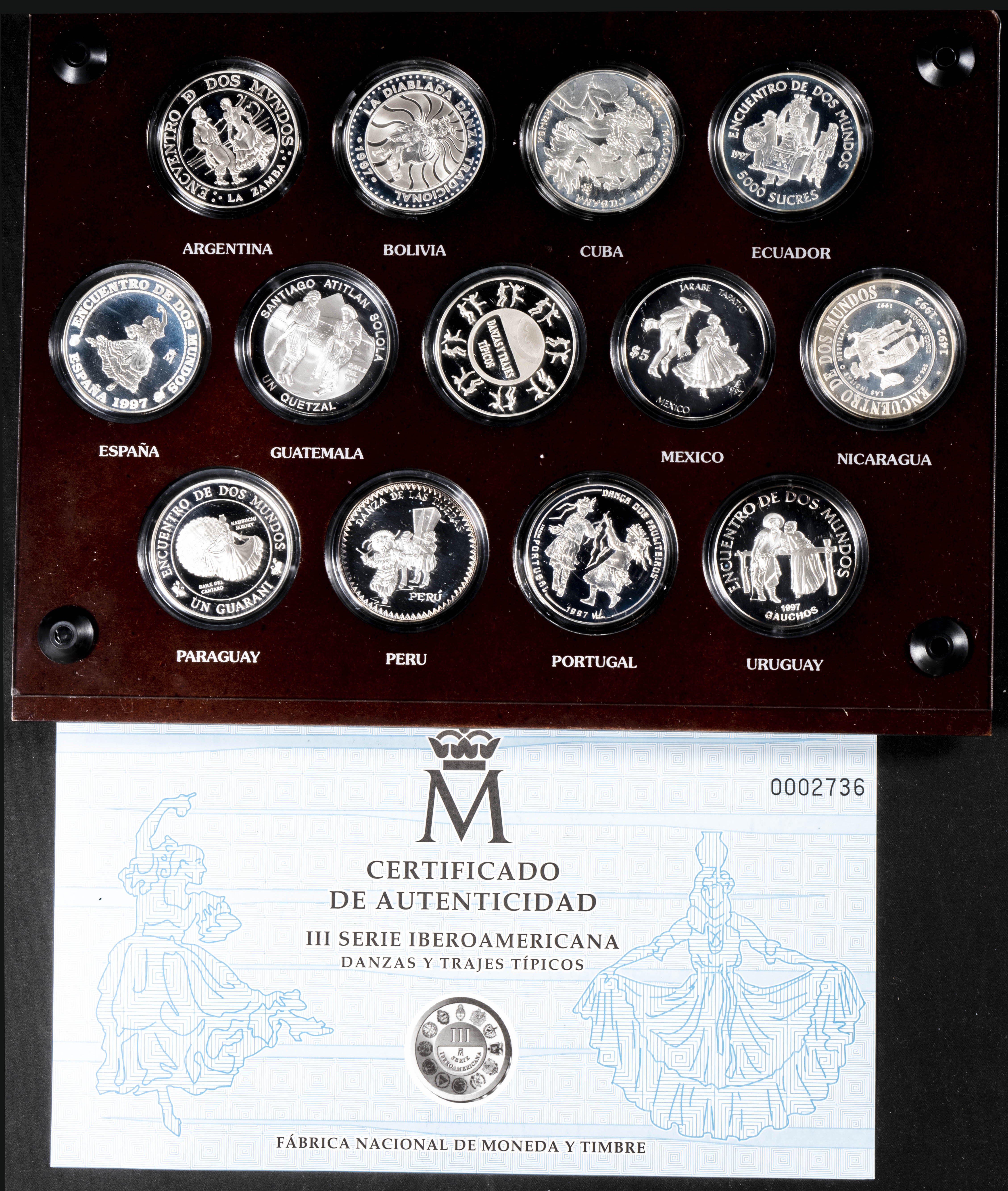 JUAN CARLOS I (1975-2014). III Serie Iberoamericana. Danzas y Trajes típicos. 1997. Estuche oficial de la FNMT conteniendo 13 monedas en plata. SC. Incluye libreto y certificado de autenticidad.