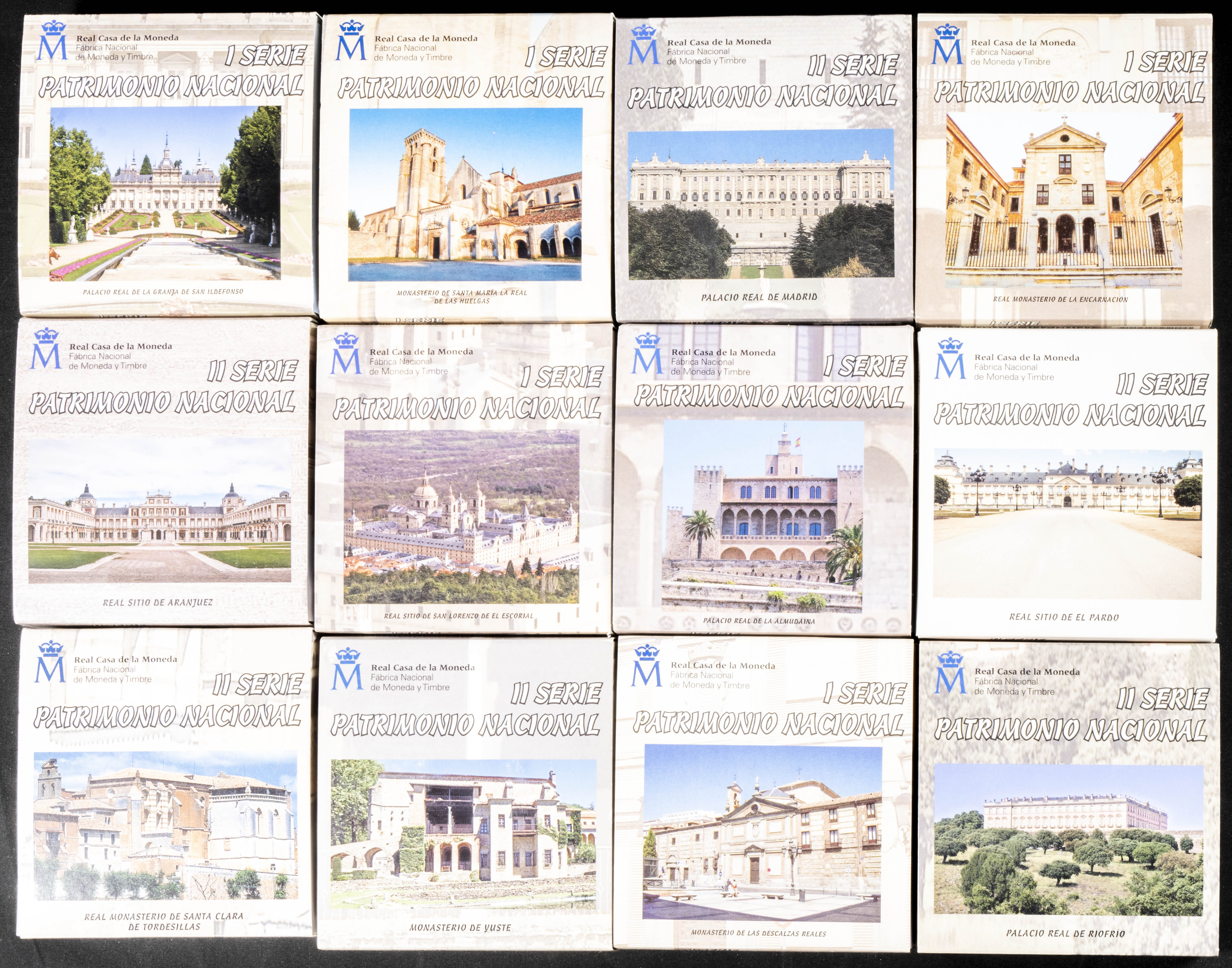 CONTEMPORÁNEO. Series completas (I y II) de la Serie Patrimonio Nacional. FNMT. 12 Monedas de 5€ en calidades PROOF que incluyen sus estuches originales así como los certificados de autenticidad. A EXAMINAR.