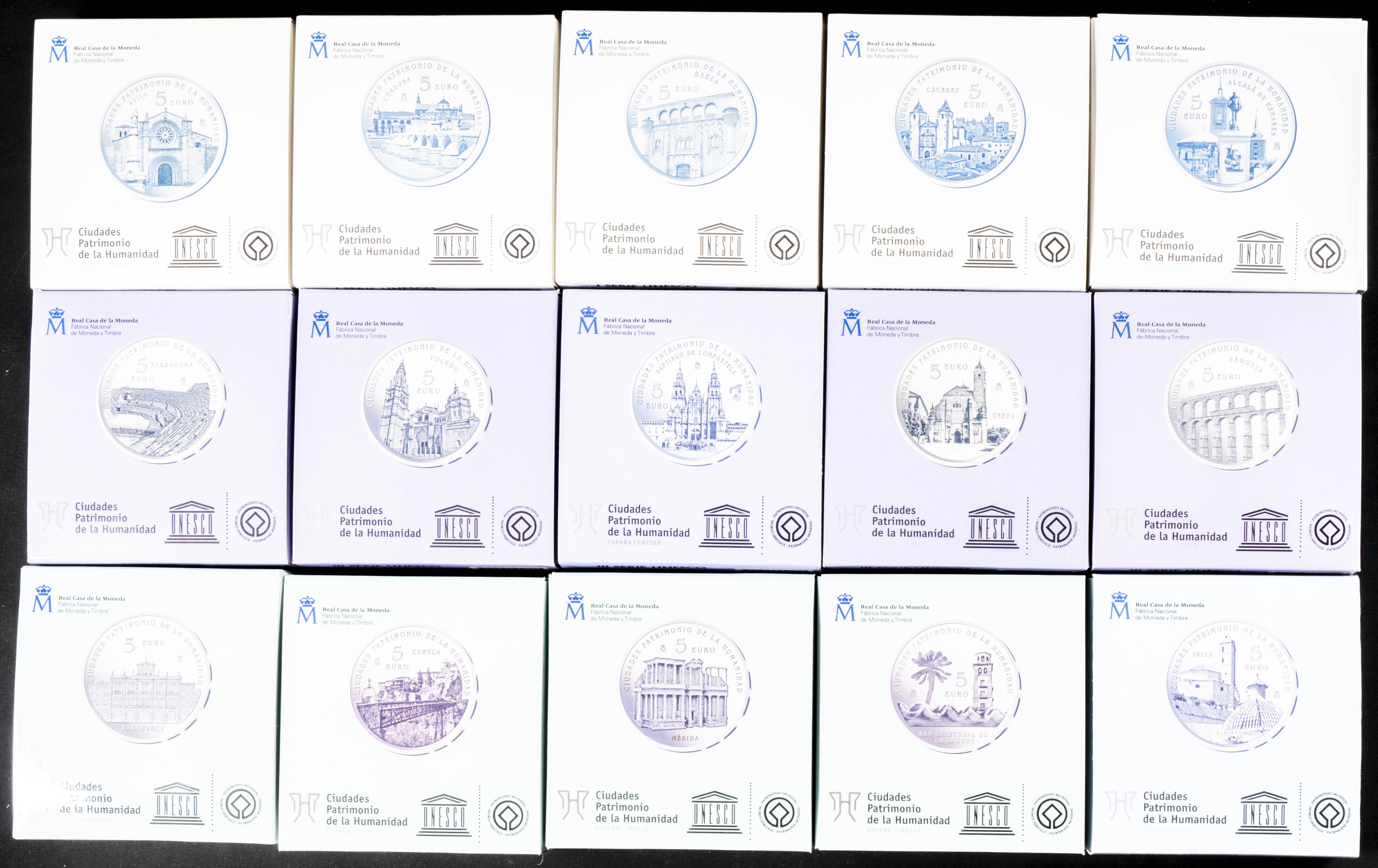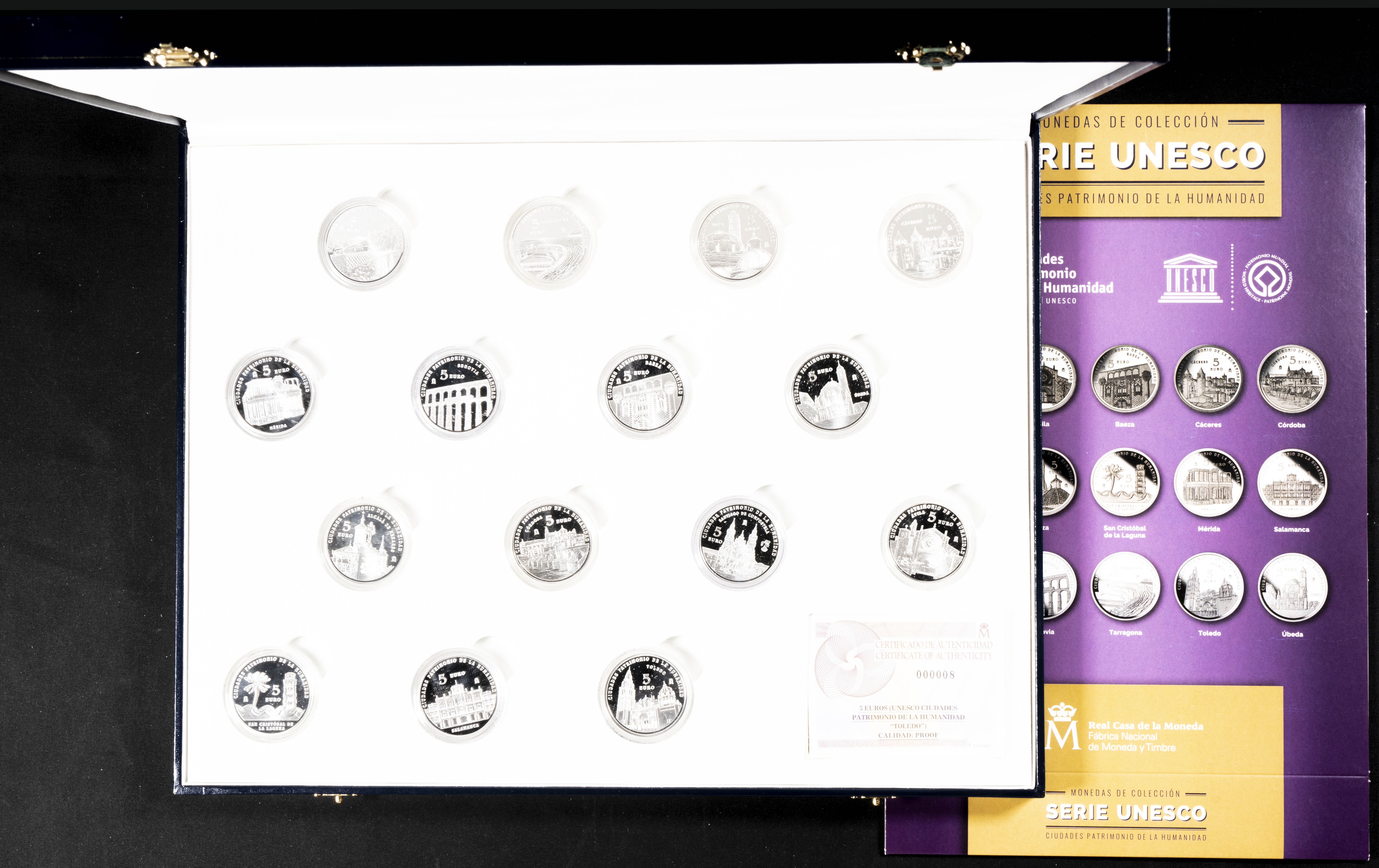 CONTEMPORÁNEO. Series completas (I, II y III) de la Serie Unesco Ciudades Patrimonio de la Humanidad. FNMT. 15 monedas de 5€ expuestas en estuche-expositor original y en calidades PROOF. Se incluyen, además, los 15 estuches individales de cada pieza así como sus certificados de autenticidad. A EXAMINAR.