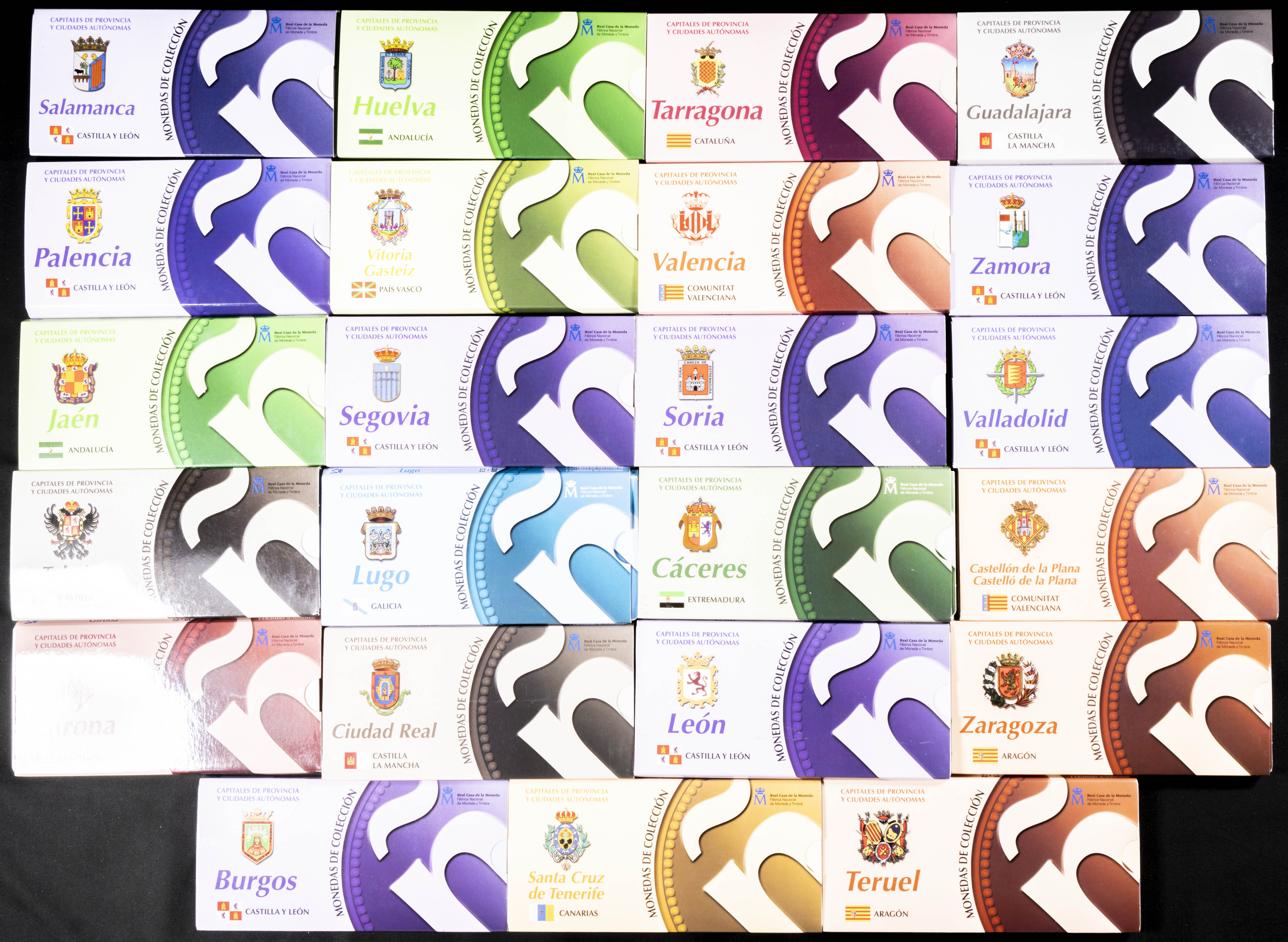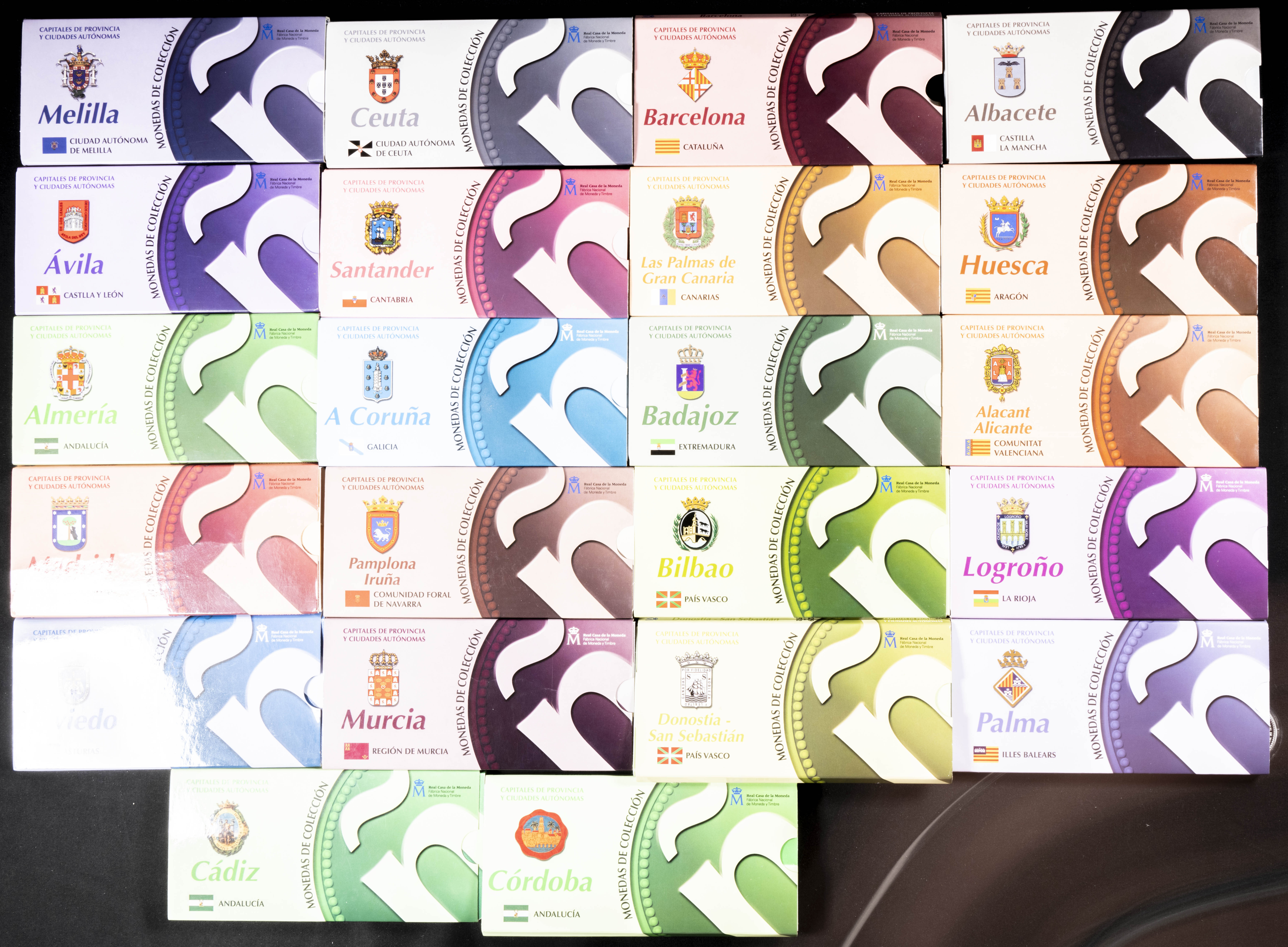 JUAN CARLOS I (1975-2014). Colección completa, a falta de siete estuches, formada por 45 monedas de 5 € en plata, ninguna repetida, correspondiente a las colección de Capitales de Provincia y Ciudades Autónomas españolas. 2010-2012. FNMT. PROOF. Incluyen todos los estuche originales, certificados de autenticidad (falta alguna).