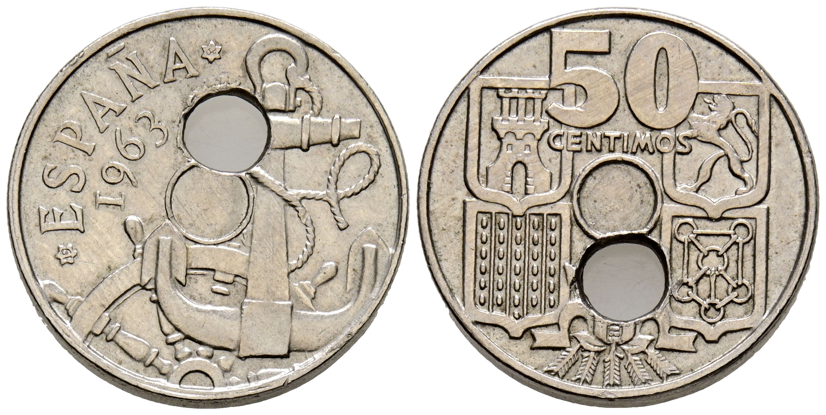 ESTADO ESPAÑOL (1936-1975). 50 Céntimos. (Cu-Ni. 4,09g/20mm). 1963 *19-64. Madrid. (Cal-2019-28). MBC+. Agujero desplazado. Estrellas visibles.