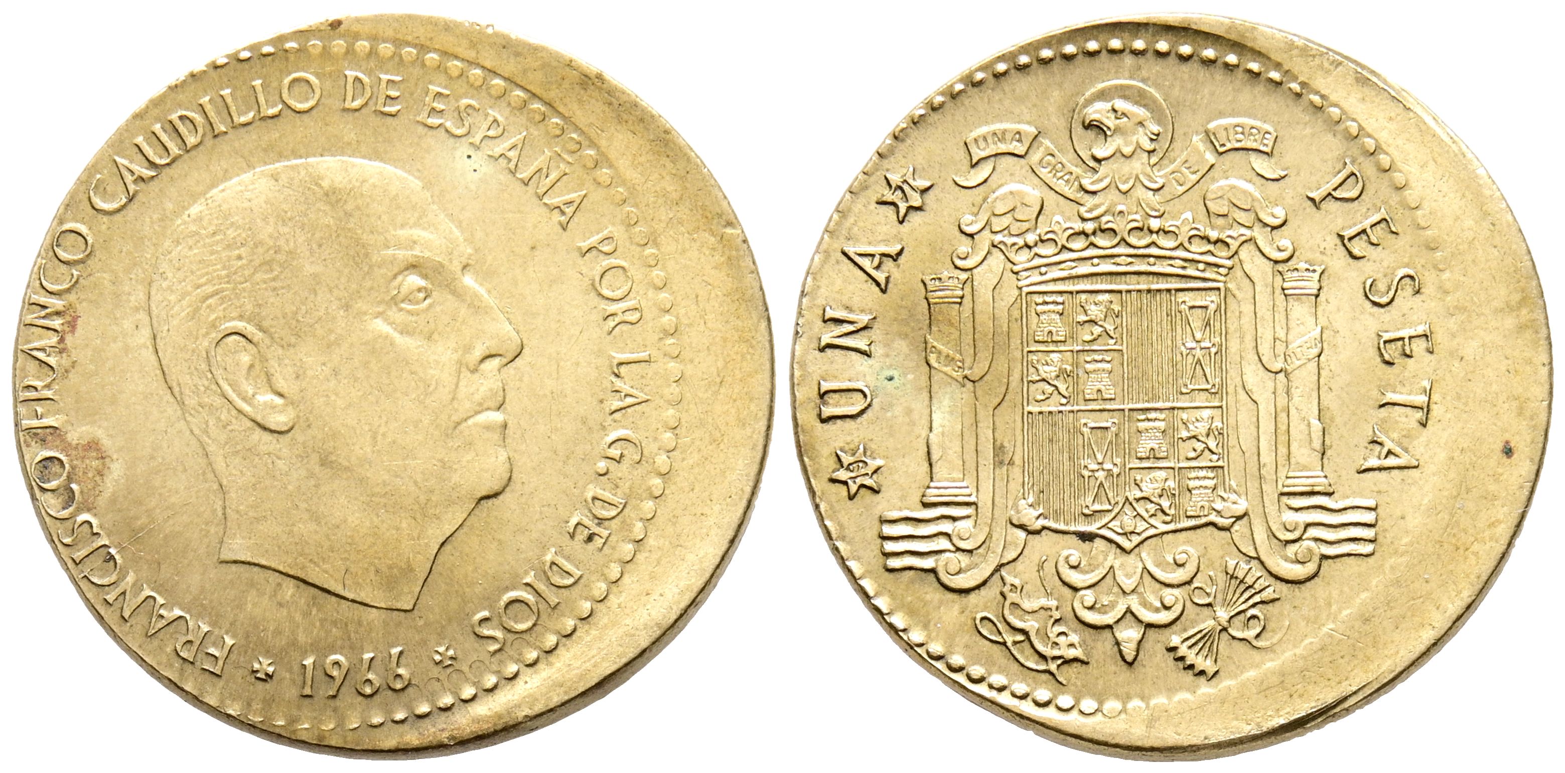 ESTADO ESPAÑOL (1936-1975). 1 Peseta. (Al-Ae. 3,46g/21mm). 1966 *19-71. Madrid. (Cal-2019-72). Acuñación desplazada: 3mm y canto redondeado. EBC-/EBC.