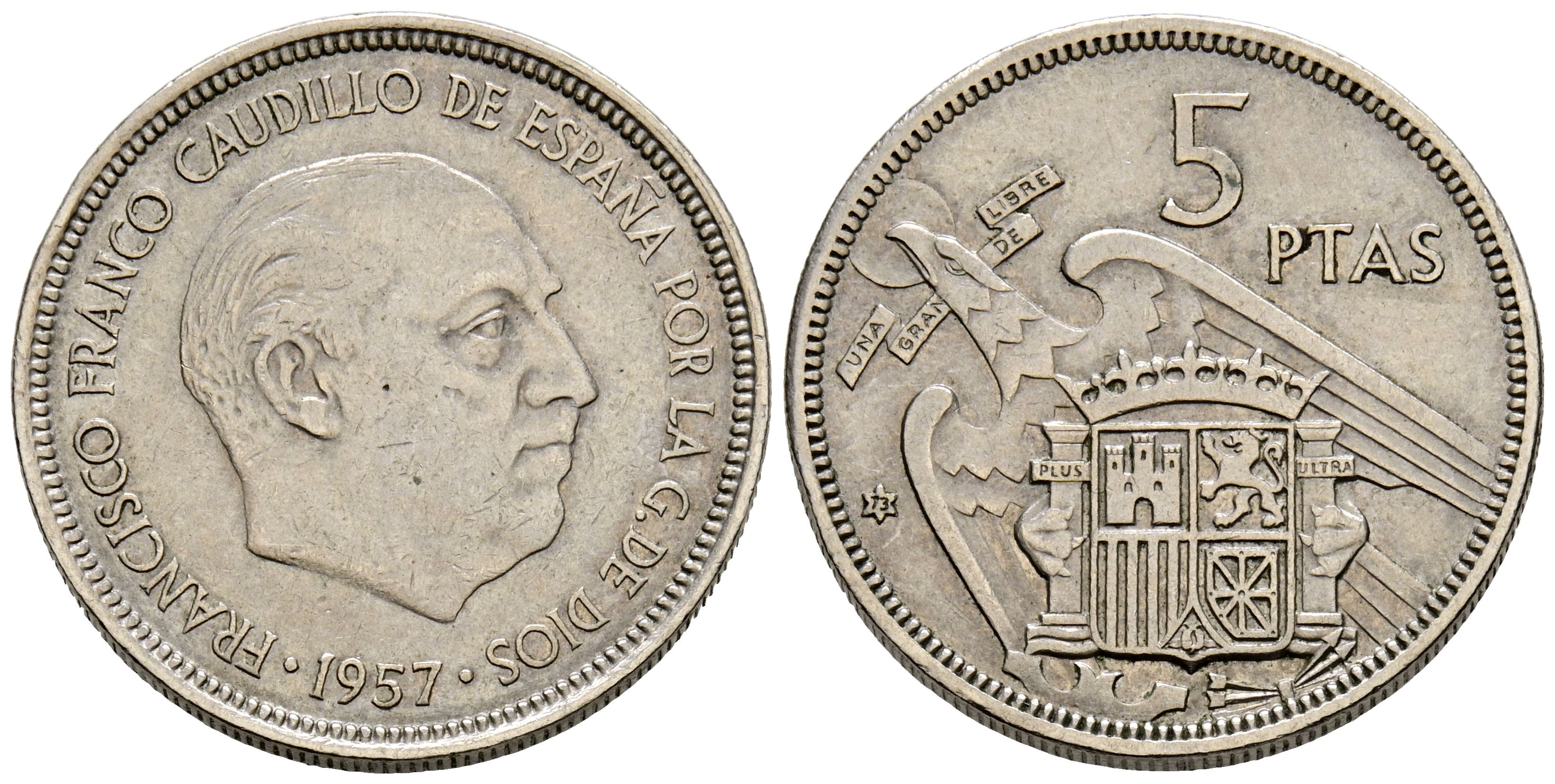ESTADO ESPAÑOL (1936-1975). 5 Pesetas. (Ni. 5,76g/23mm). 1957 *73. (Cal-2019-113). Reverso girado aprox 90º. MBC.