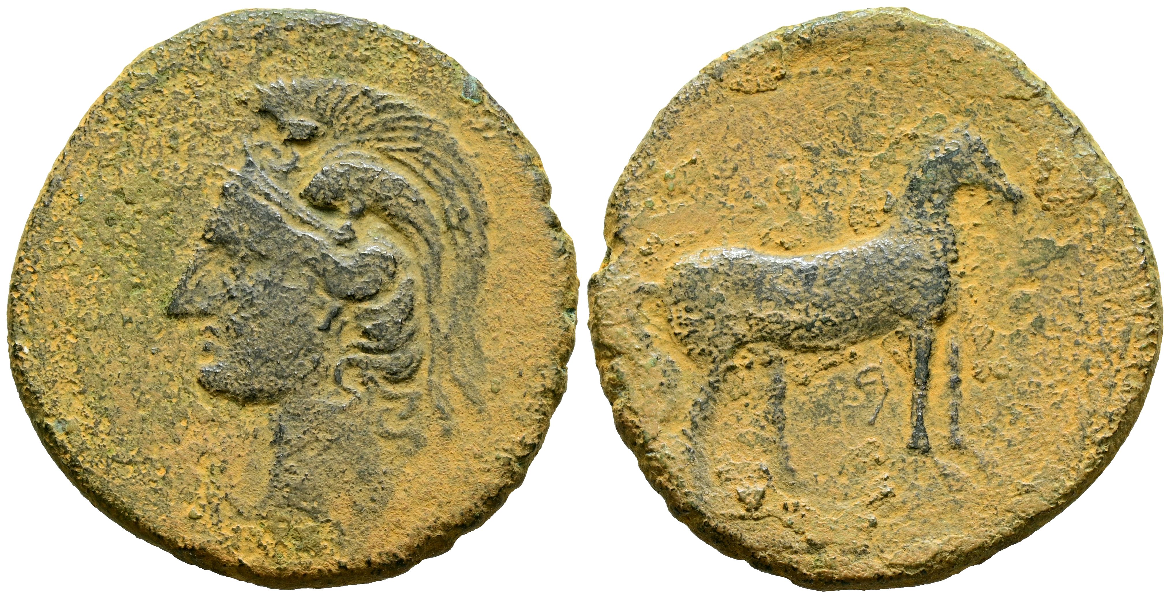 CARTAGONOVA (Cartagena, Murcia). Calco. (Ae. 11,05g/29mm). 220-215 a.C. (FAB-525). Anv: Cabeza de Atenea a izquierda. Rev: Caballo parado a derecha. MBC-.