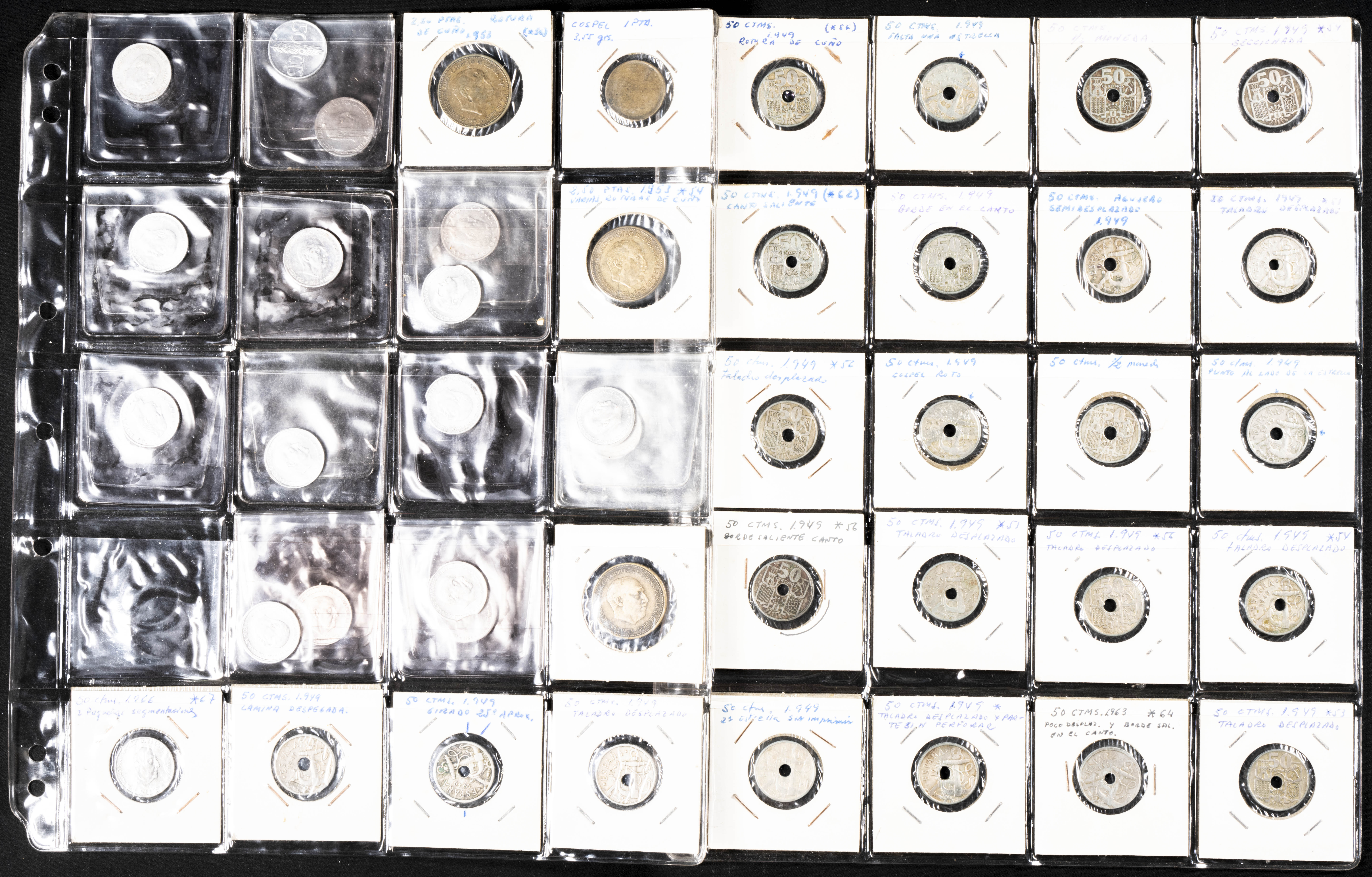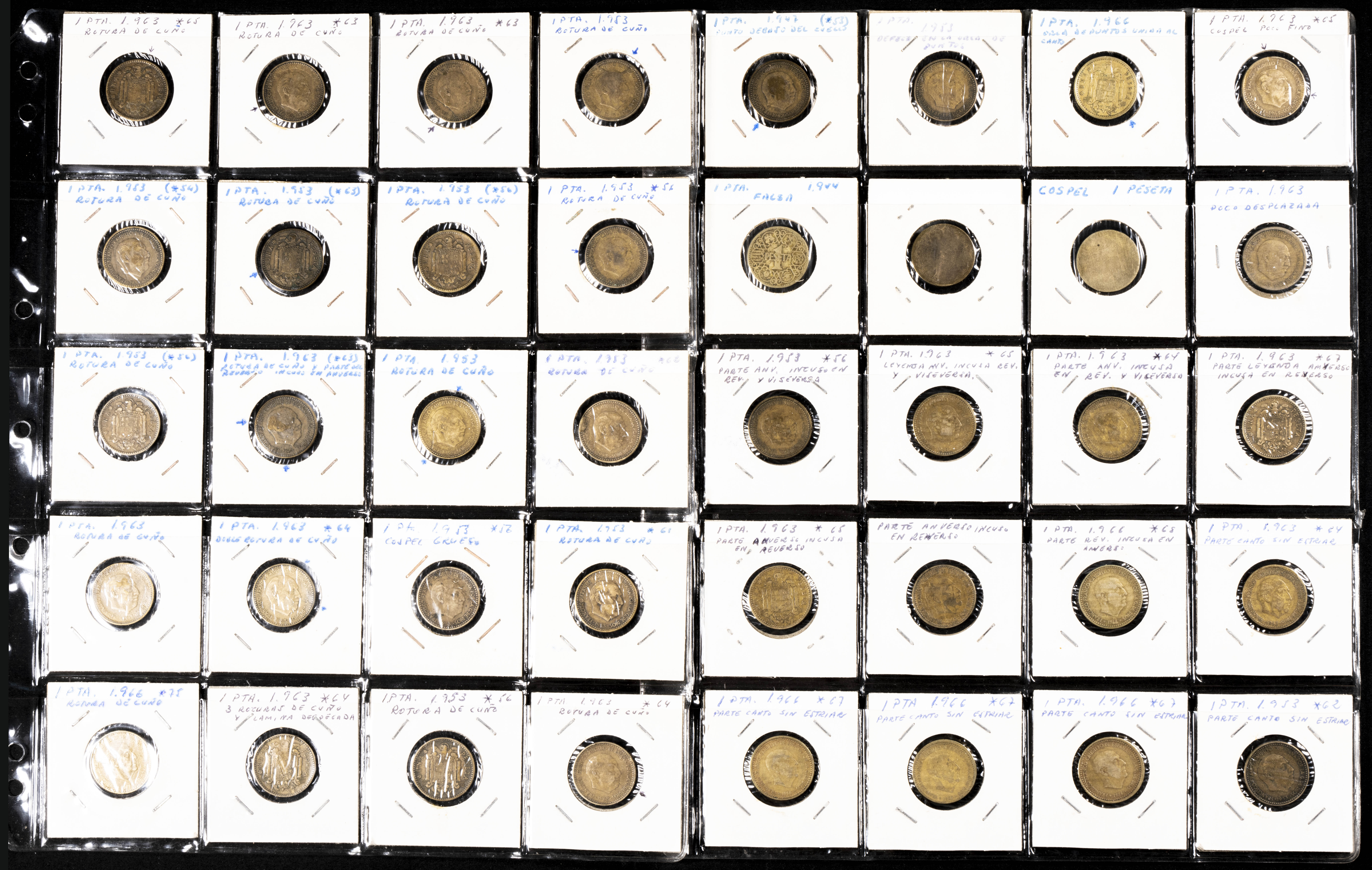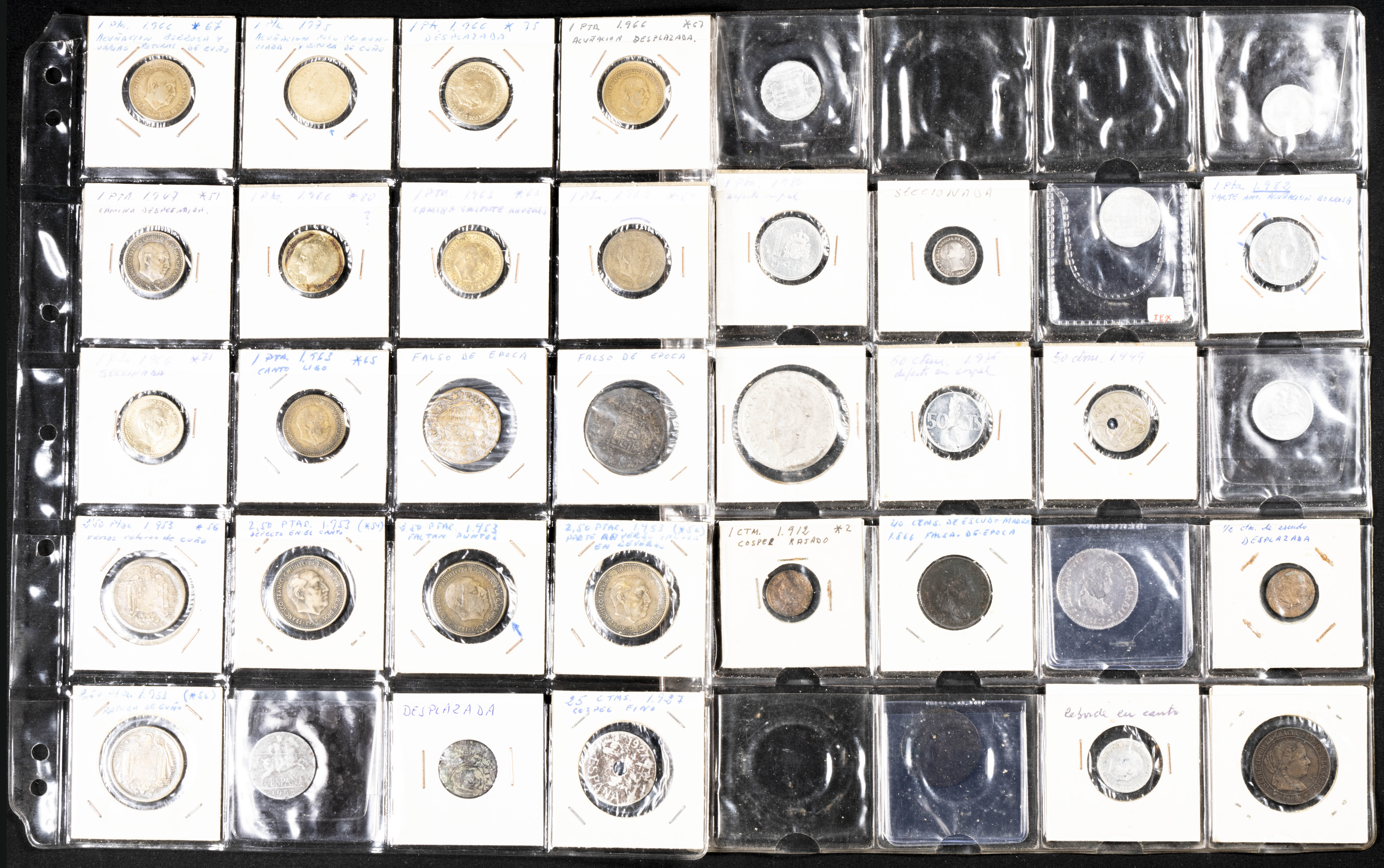 Extraordinario y amplio conjunto formado por más de 500 piezas de diferentes periodos, principalmente Estado Español y reinado de Juan Carlos I, con errores y variantes de acuñación: desplazamientos, reversos girados, diferentes grosores de cospel, segmentaciones etc. El conjunto incluye también un pequño conjunto de falsas de épocas. Diferentes estados de conservación. IMPRESCINDIBLE EXAMINAR.