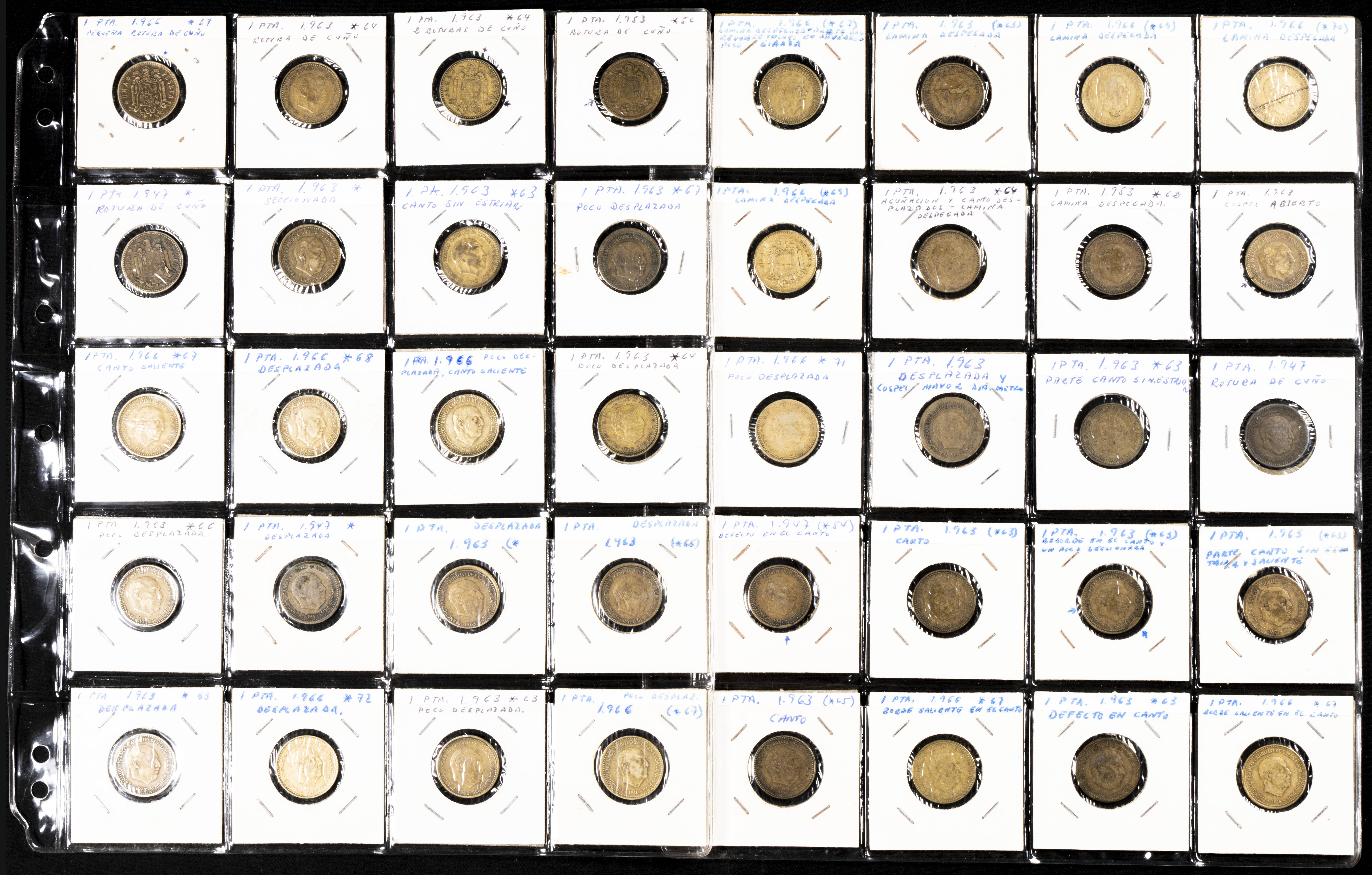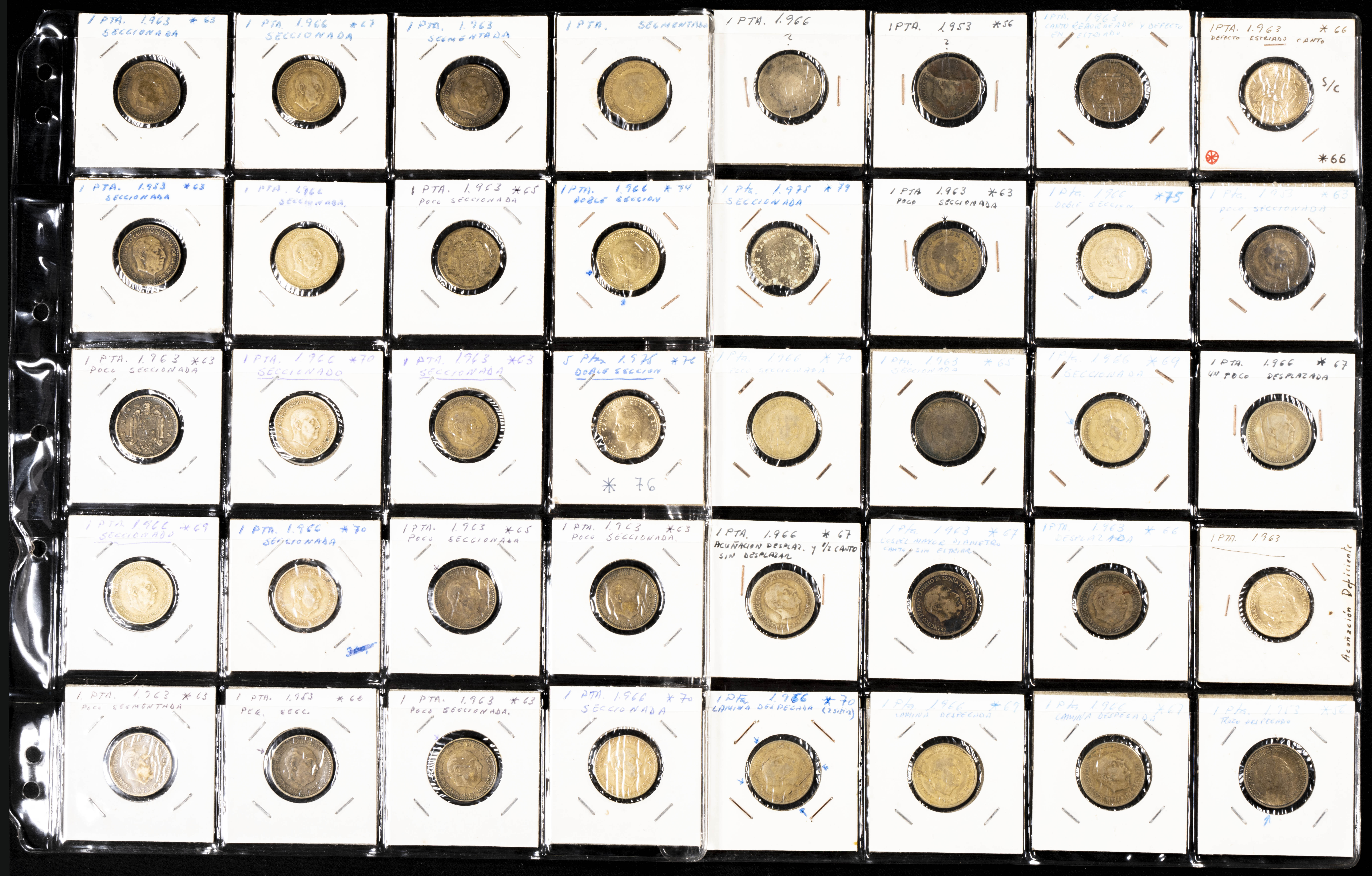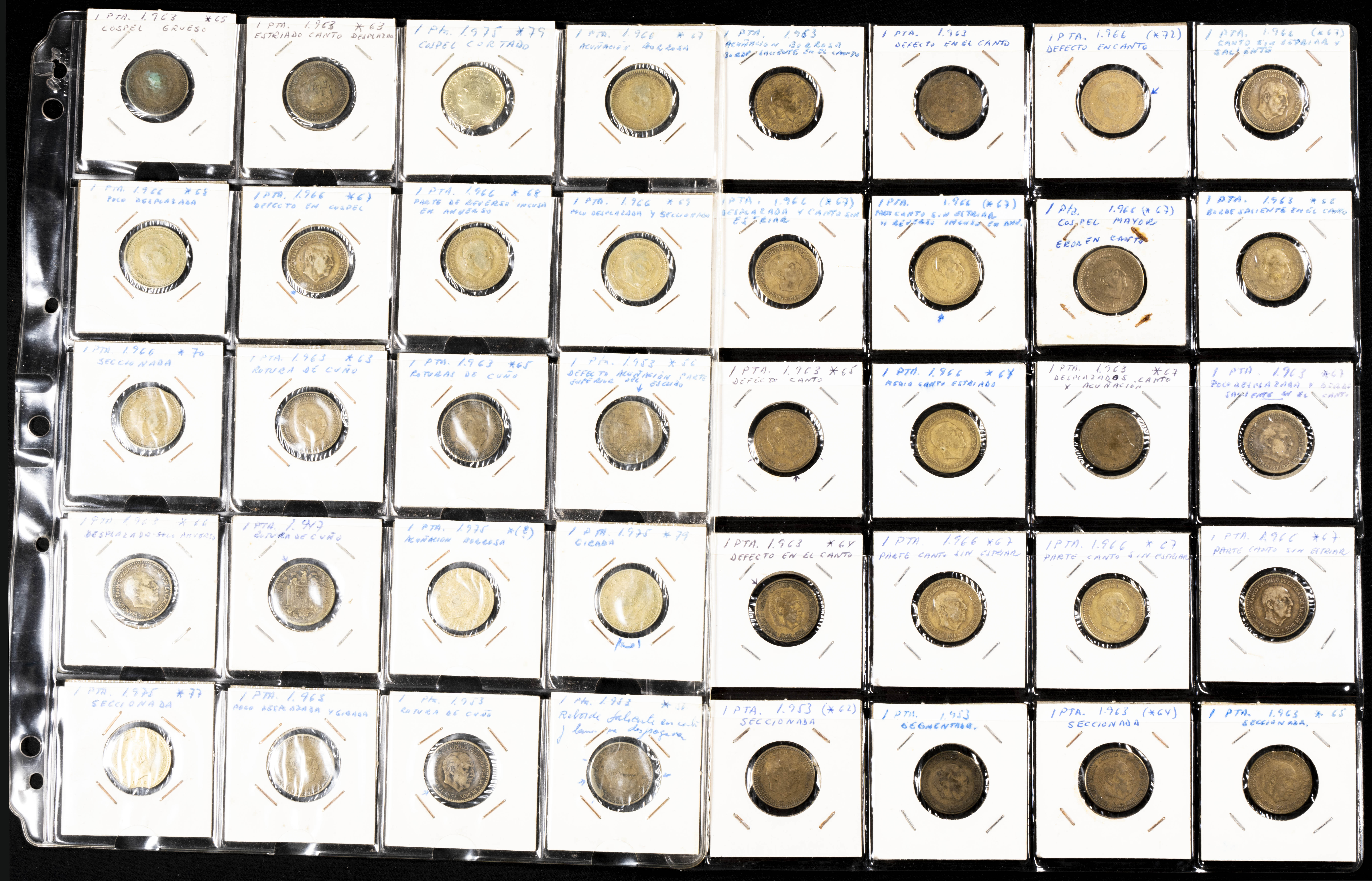 Extraordinario y amplio conjunto formado por más de 500 piezas de diferentes periodos, principalmente Estado Español y reinado de Juan Carlos I, con errores y variantes de acuñación: desplazamientos, reversos girados, diferentes grosores de cospel, segmentaciones etc. El conjunto incluye también un pequño conjunto de falsas de épocas. Diferentes estados de conservación. IMPRESCINDIBLE EXAMINAR.