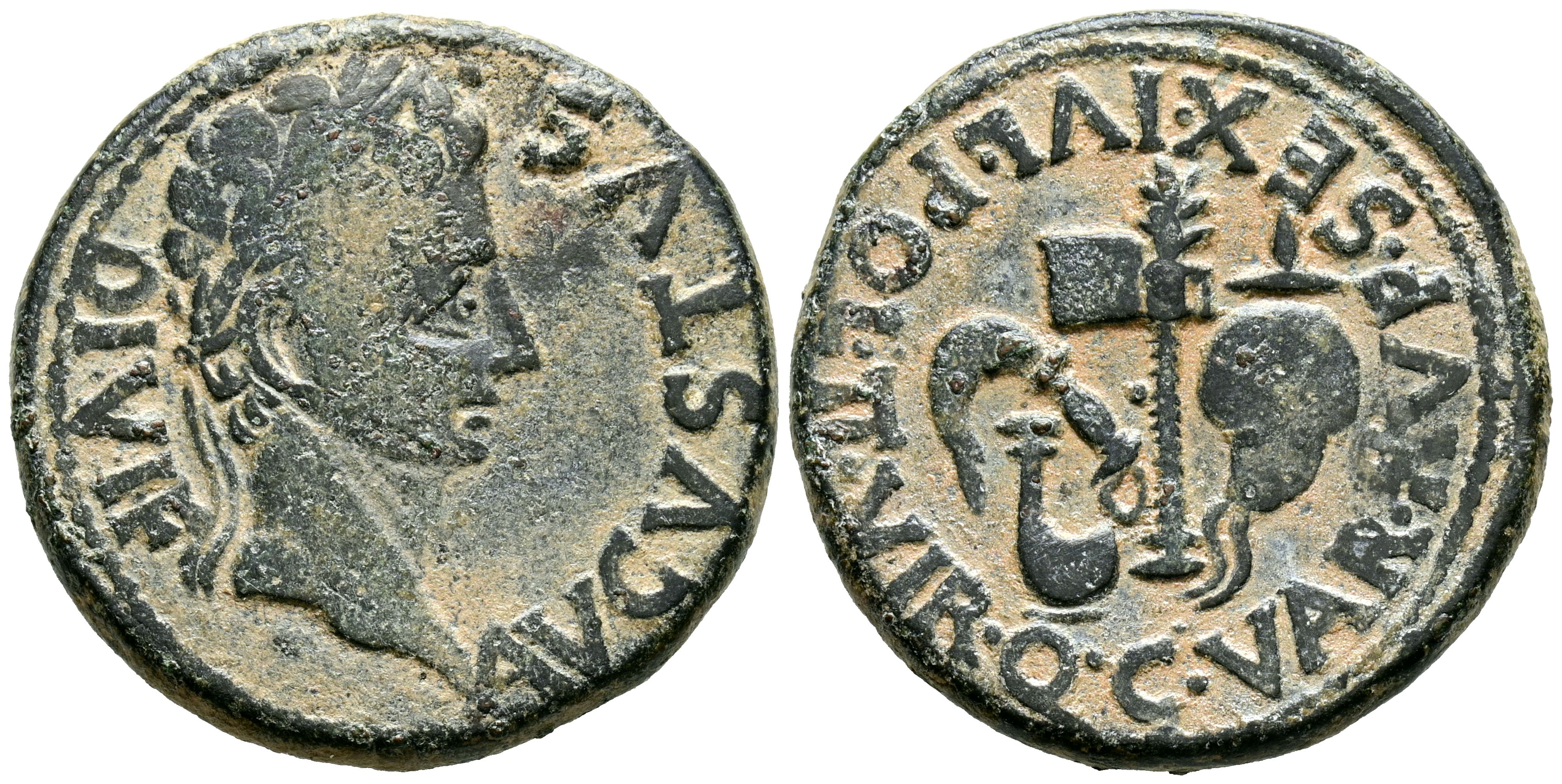 CARTAGONOVA (Cartagena, Murcia). As. (Ae. 13,25g/28mm). 27 a.C.-14 d.C. (FAB-577). Anv: Cabeza de Augusto laureado a derecha, alrededor leyenda: AVGVSTVS DIVI F. Rev: Aspérgilo, símpulo, segur y apex, alrededor leyenda: C VAR RVF SEX IVL POL II VOR Q. MBC-.