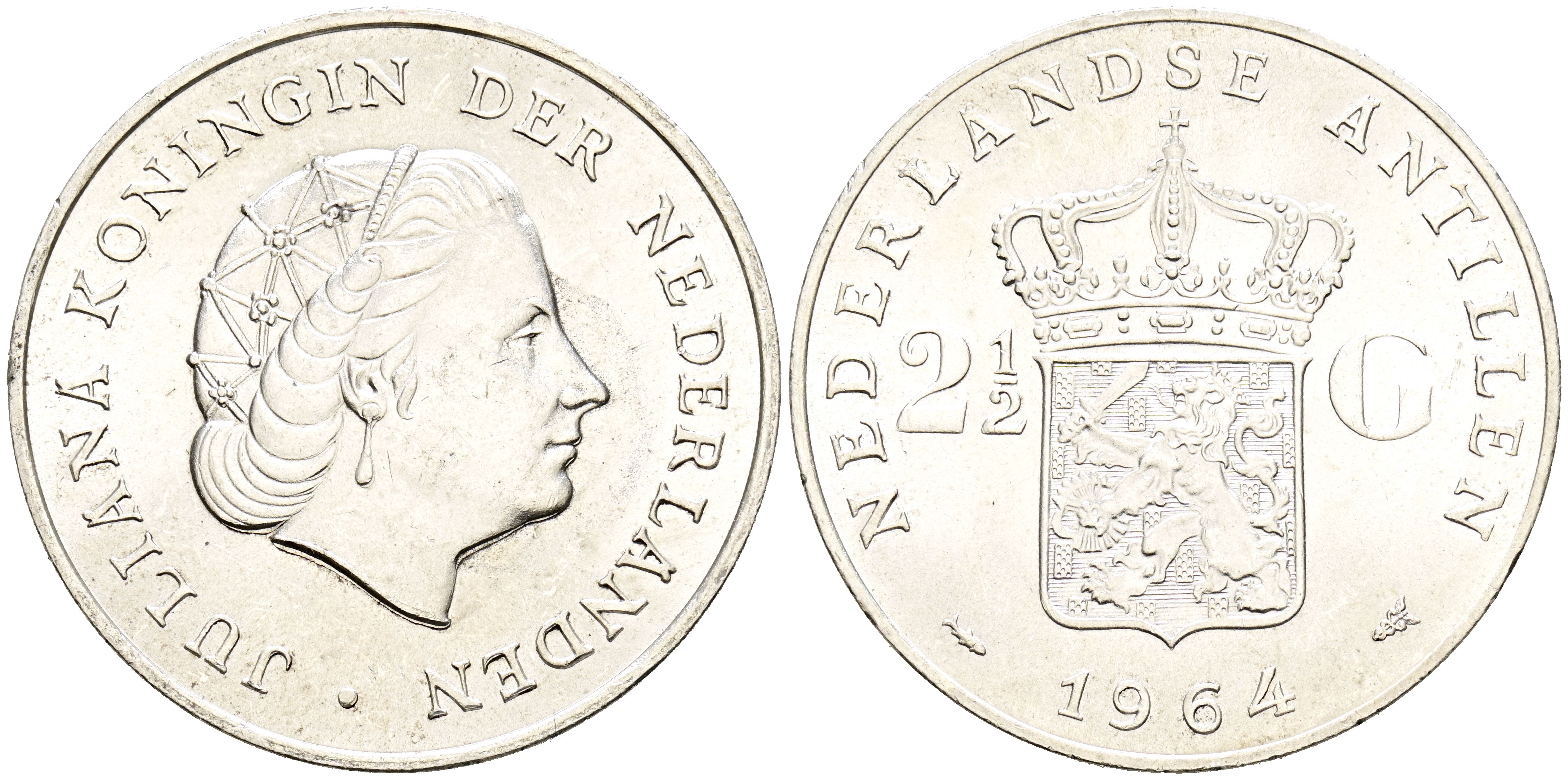 ANTILLAS HOLANDESAS. 2 1/2 Gulden. (Ar. 25,02g/38mm). 1964. Reina Juliana. (Km#7). SC-. Leves marquitas.