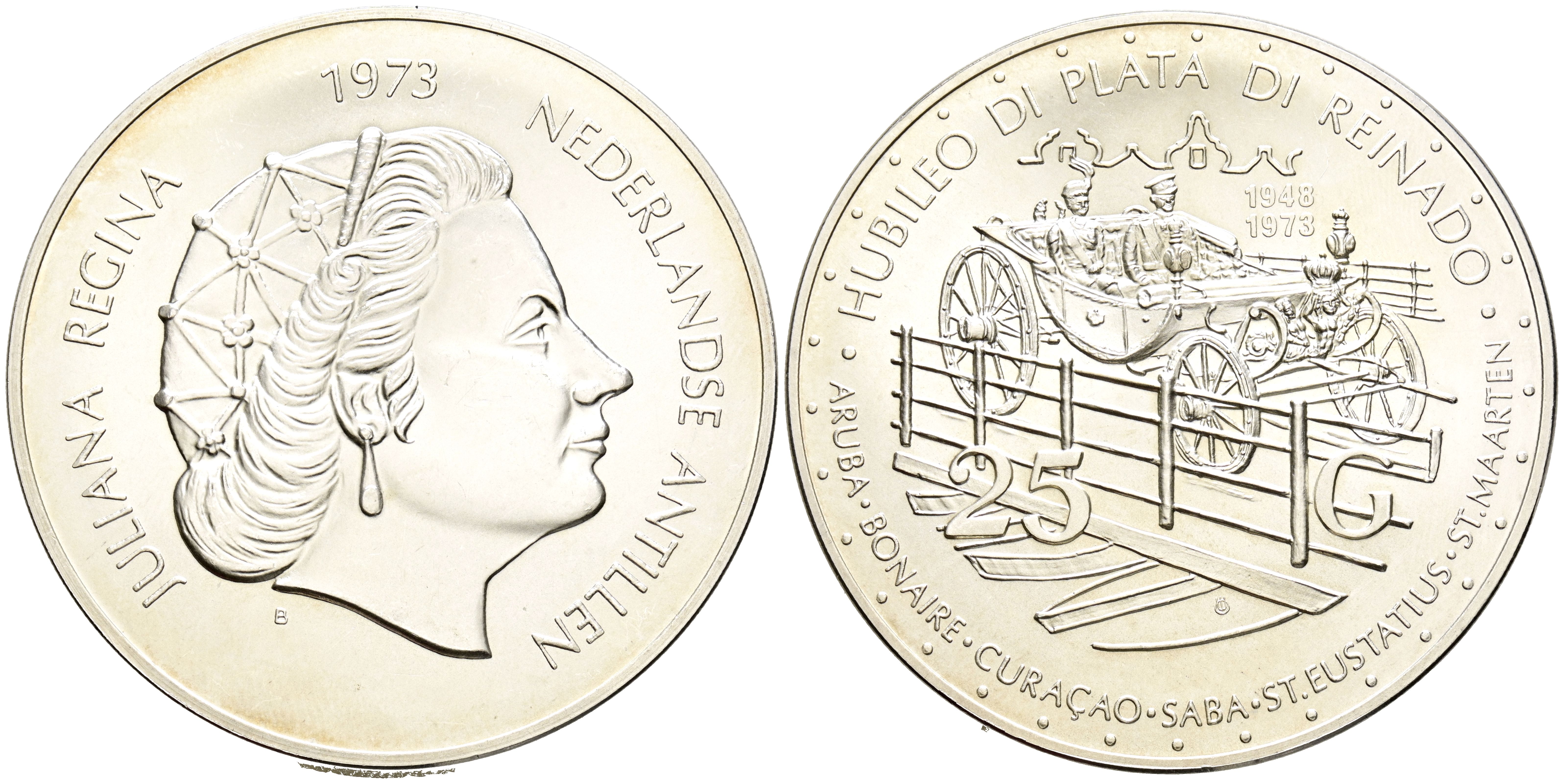 ANTILLAS (Holandesas). 25 Gulden. (Ae. 41,76g/45mm). 1973. Jubileo de la Reina. (Km#14). SC.