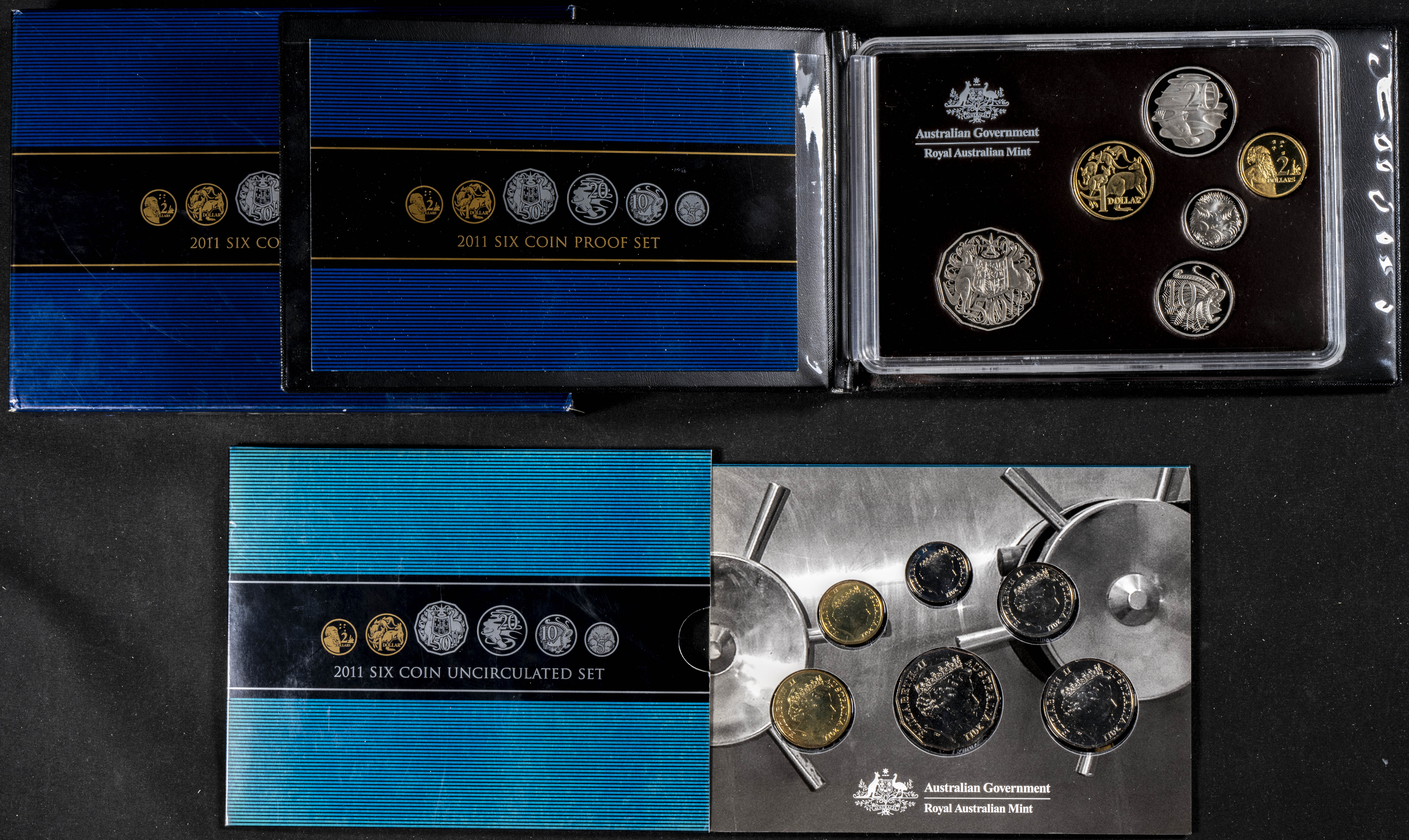 AUSTRALIA. Interesante y escasa pareja de Sets de monedas de 2011 acuñadas por la Royal Australian Mint: PROOF set y Uncirculated set. 6 monedas de diferentes módulos y valores en cada estuche. A EXAMINAR