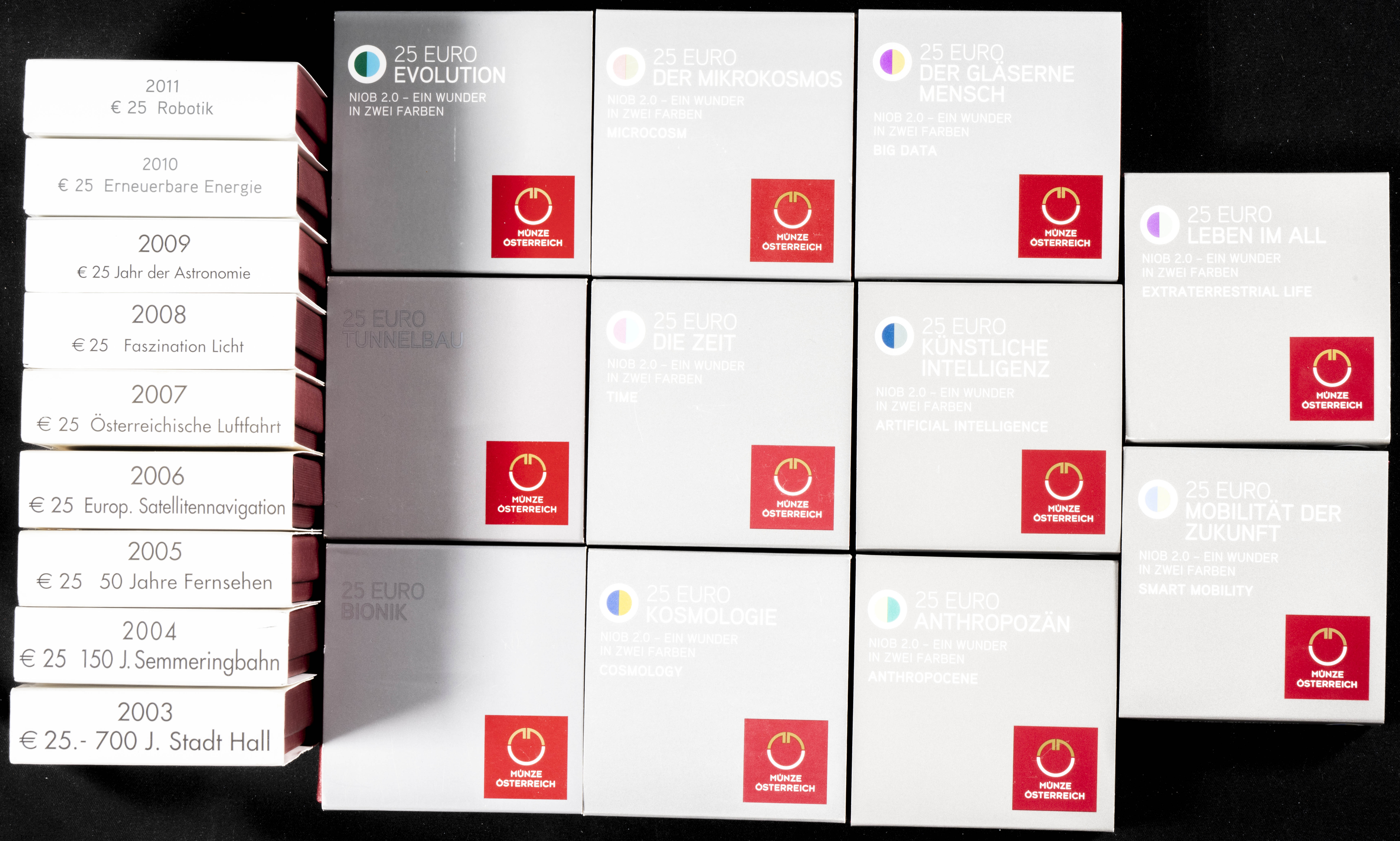 AUSTRIA. Magnífica y completa colección formada por 20 monedas de 25 Euros acuñadas por la Münze Österreich entre 2003 y 2022. Todos los años de esta horquilla representados (incluídas las primeras tiradas, más escasas en la actualidad) y sin piezas repetidas. Serie dedicada a los avances tecnológicos y que destacan por su fabricación con un cospel bimetálico en plata y niobio. Incluye bandeja expositora Leuchtturm y todos los estuches oficiales con certificados de autenticidad. Perfecto nivel de conservación. A EXAMINAR.