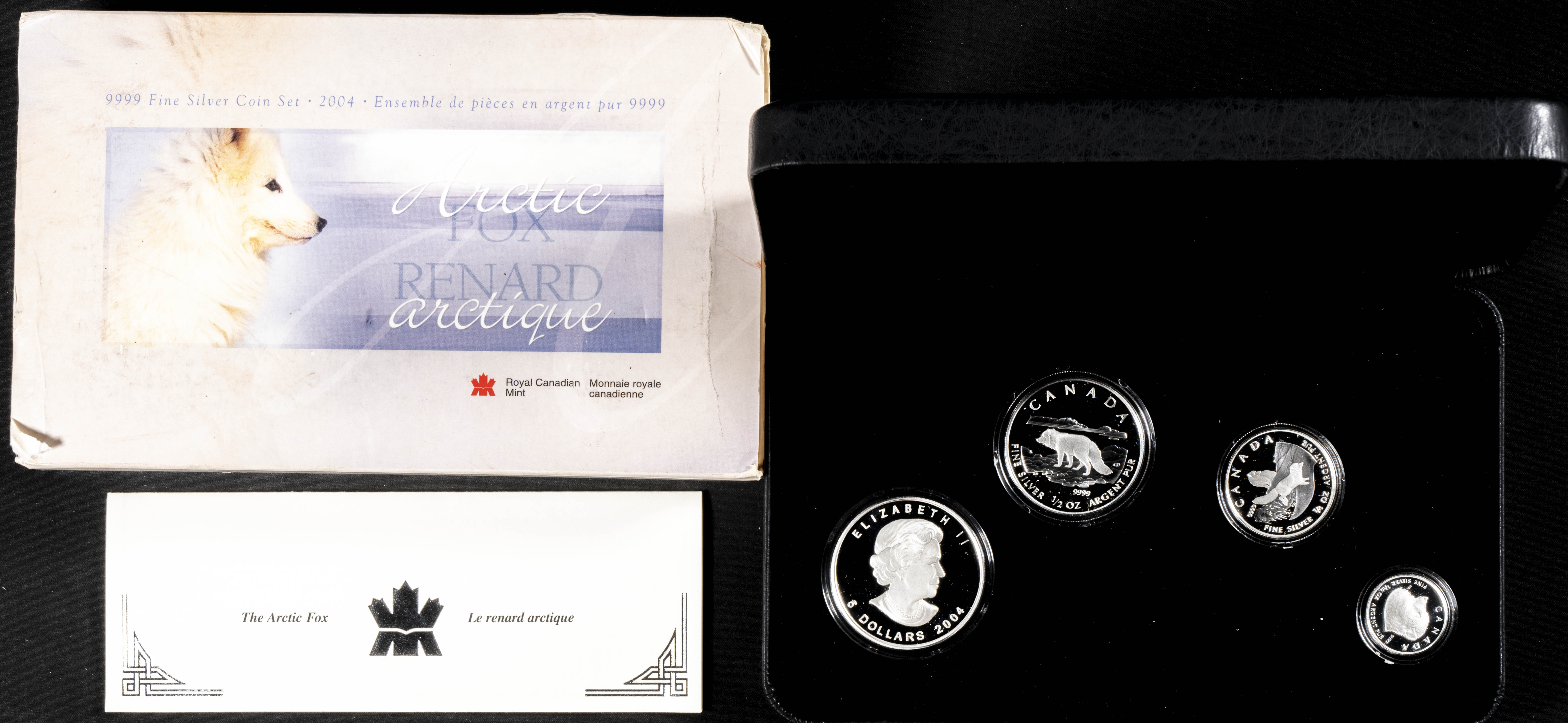 CANADÁ. Estuche oficial y completo con 4 valores en plata pura dedicado al "Zorro ártico". 2004. PROOF. Incluye certificado de autenticidad.