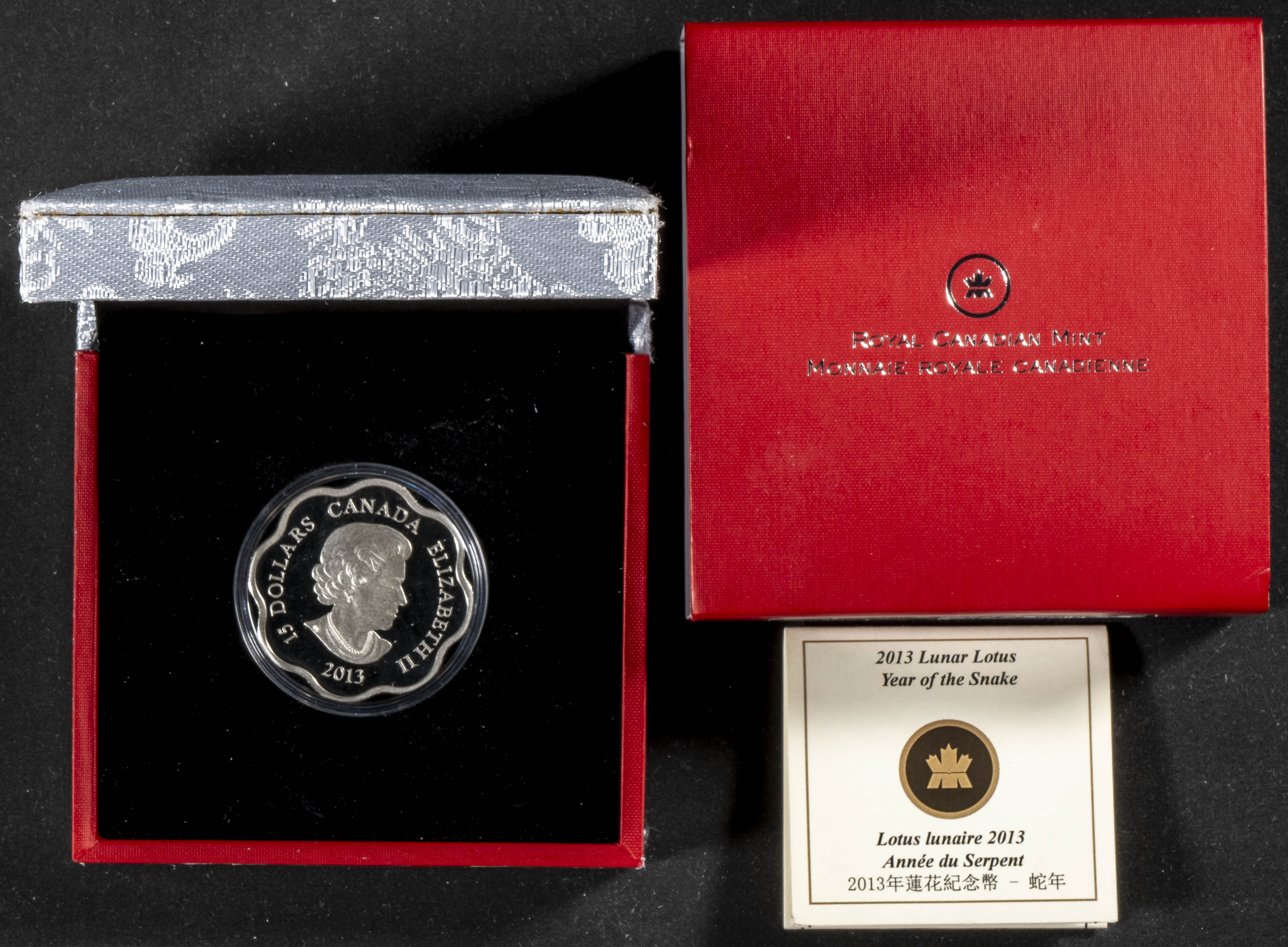 CANADÁ. 15 Dollars (Ar. 26,70g/38mm). 2013. Lunar Lotus. Año de la Serpiente. (Km#1359). PROOF. Incluye estuche original y certificado de autenticidad.