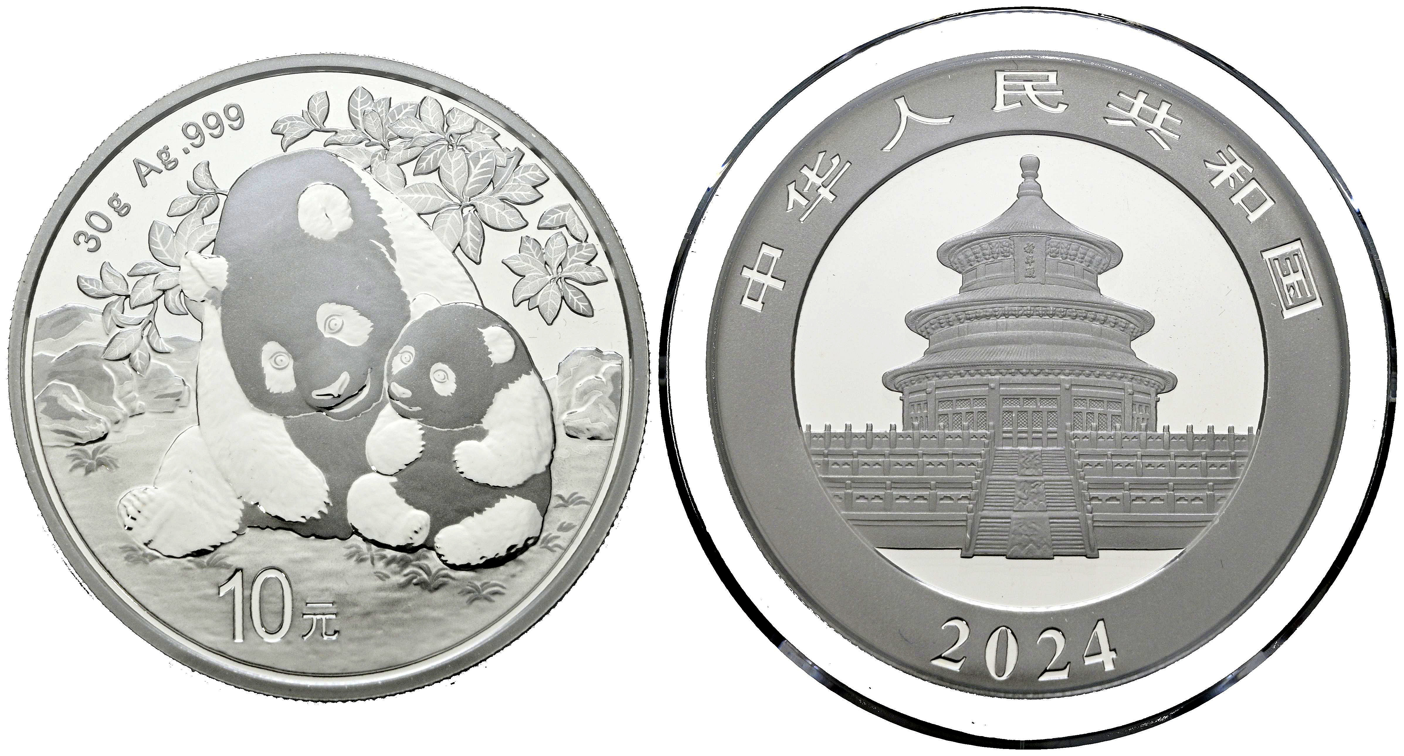 CHINA. 10 Yuan. (Ar. 30,00g/40mm)*. 2024. Serie Panda. Encapsulado por PCGS MS 70, First Day of Issue. *Peso y medidas teóricos.