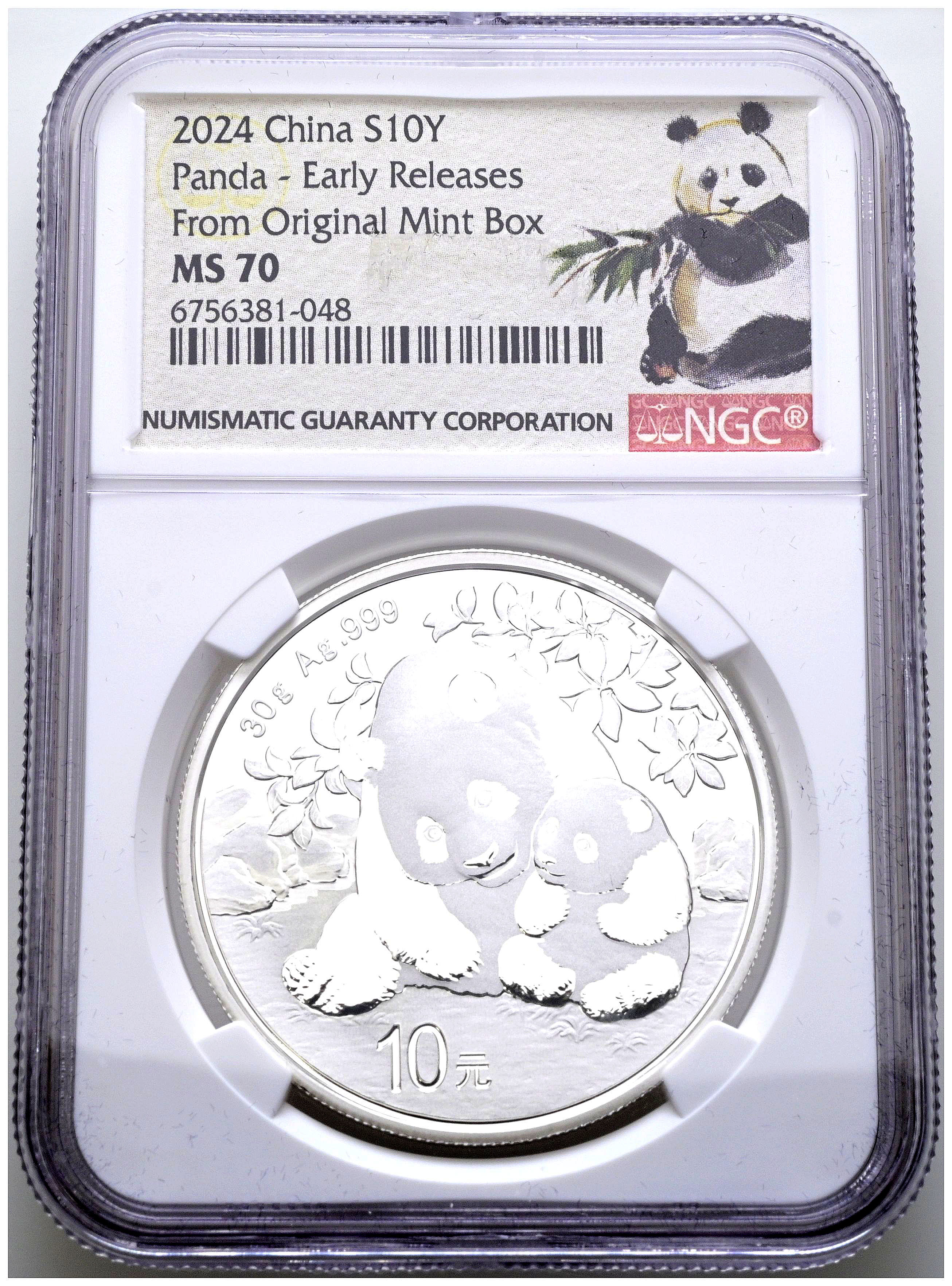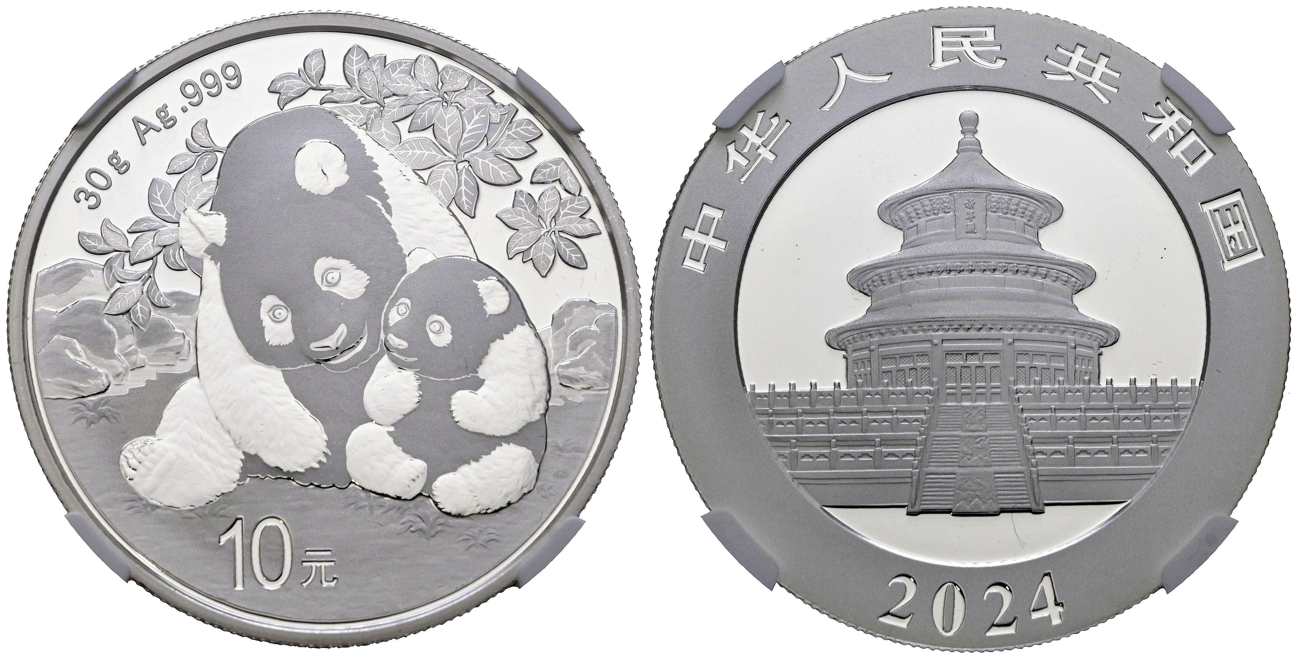CHINA. 10 Yuan. (Ar. 30,00g/40mm)*. 2024. Serie Panda. Encapsulado por NGC. MS 70, Early Releases from Original Mint Box. *Peso y medidas teóricos.