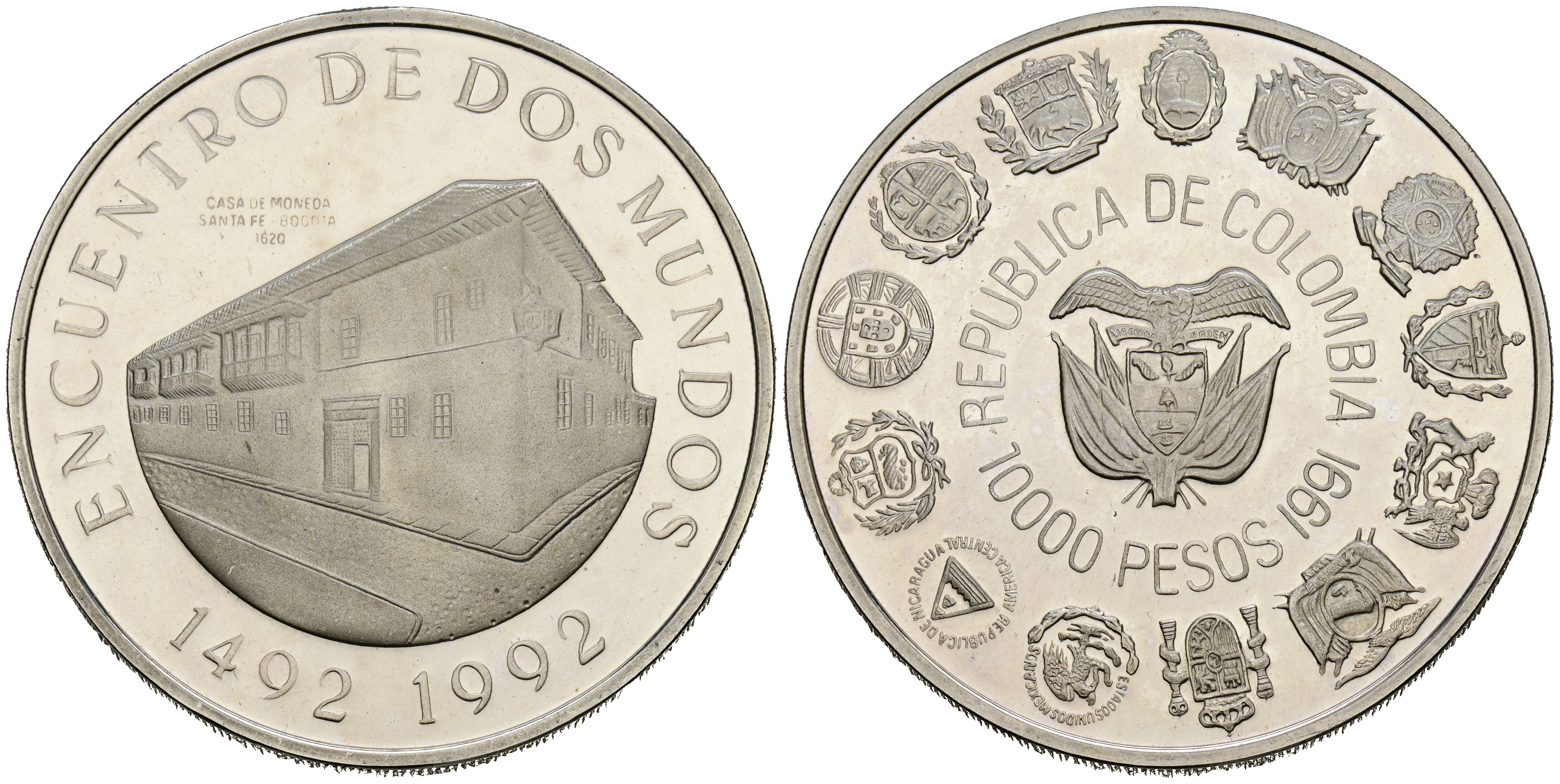 COLOMBIA. 10.000 Pesos. (Ar. 27,12g/40mm). 1992. Encuentro de Dos Mundos. (Km#284). PROOF. Tirada de 7000 piezas.