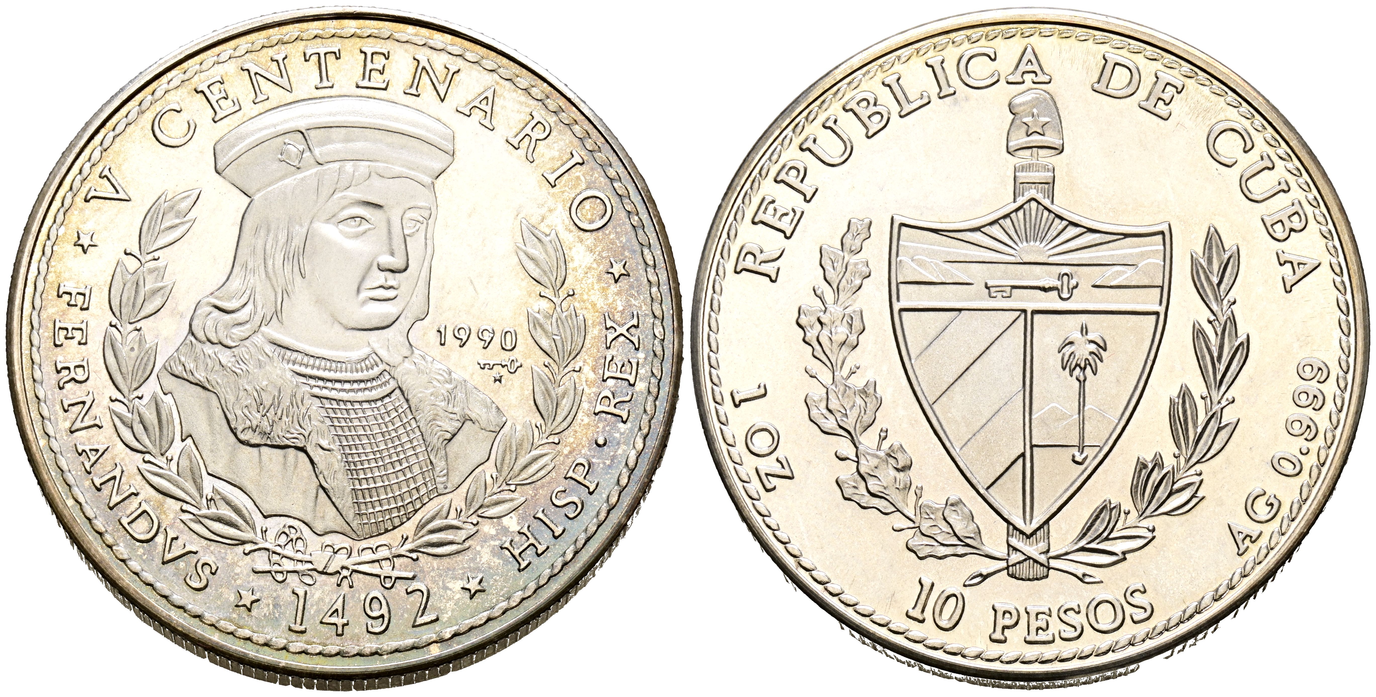 CUBA. 10 Pesos (Ar. 31,03g/33mm). 1990. Fernando el Católico. Serie V Centenario. (Km#263). PROOF. Tirada de 5000 ejemplares.