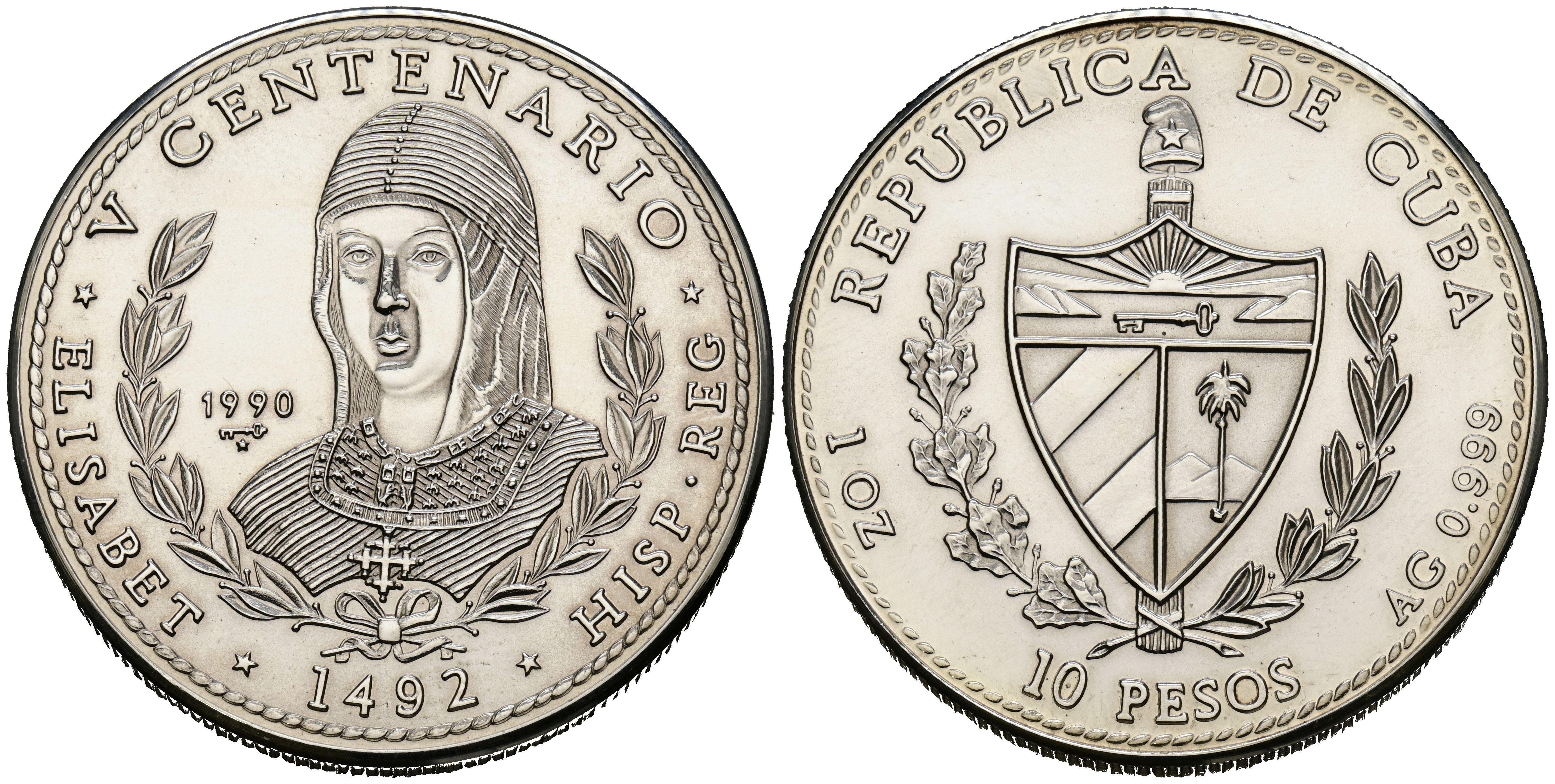 CUBA. 10 Pesos. (Ar. 31,03g/38mm). 1990. V Centenario. Isabel la Católica. (Km#264). PROOF.