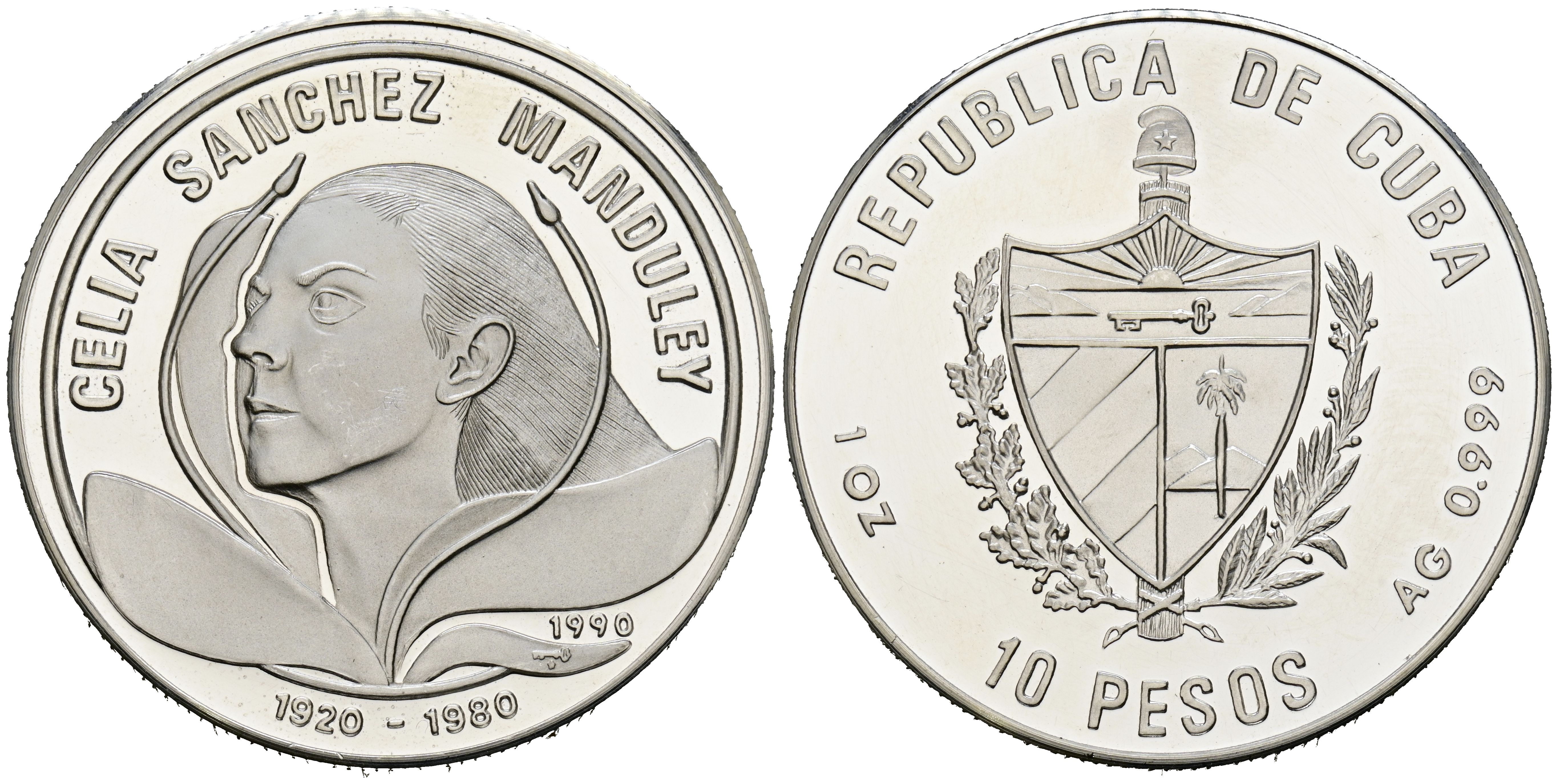 CUBA. 10 Pesos. (Ar. 31,10g/38mm). 1990. Celia Sánchez Manduley. (Km#262.1). PROOF. Tirada de 2000 unidades.