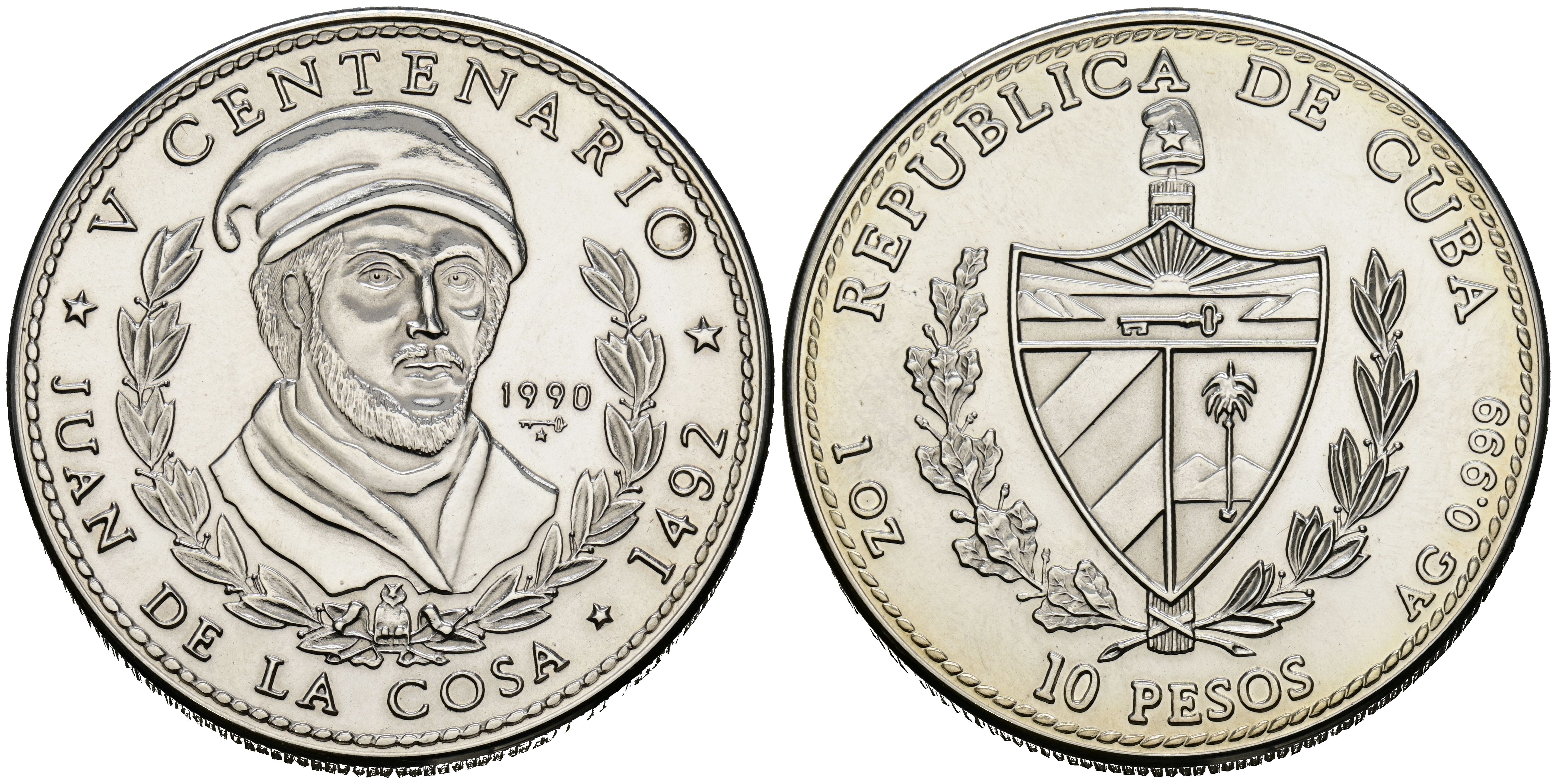 CUBA. 10 Pesos. (Ar. 31,04g/38mm). 1990. Juan de la Cosa. (Km#266). PROOF.