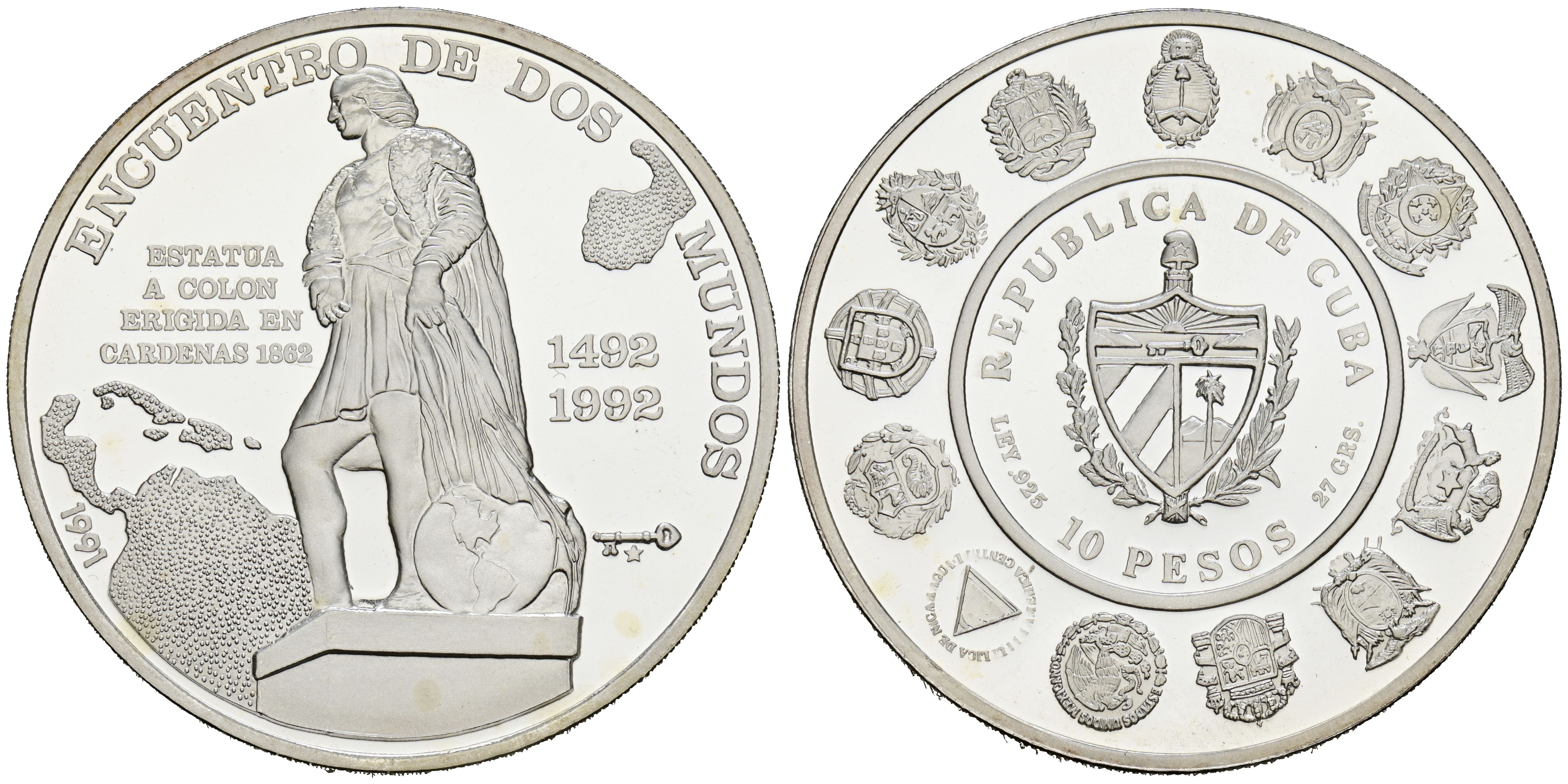 CUBA. 10 Pesos. (Ar. 27,00g/35mm). 1991. Encuentro de Dos Mundos. (Km#337). PROOF. Escasa.