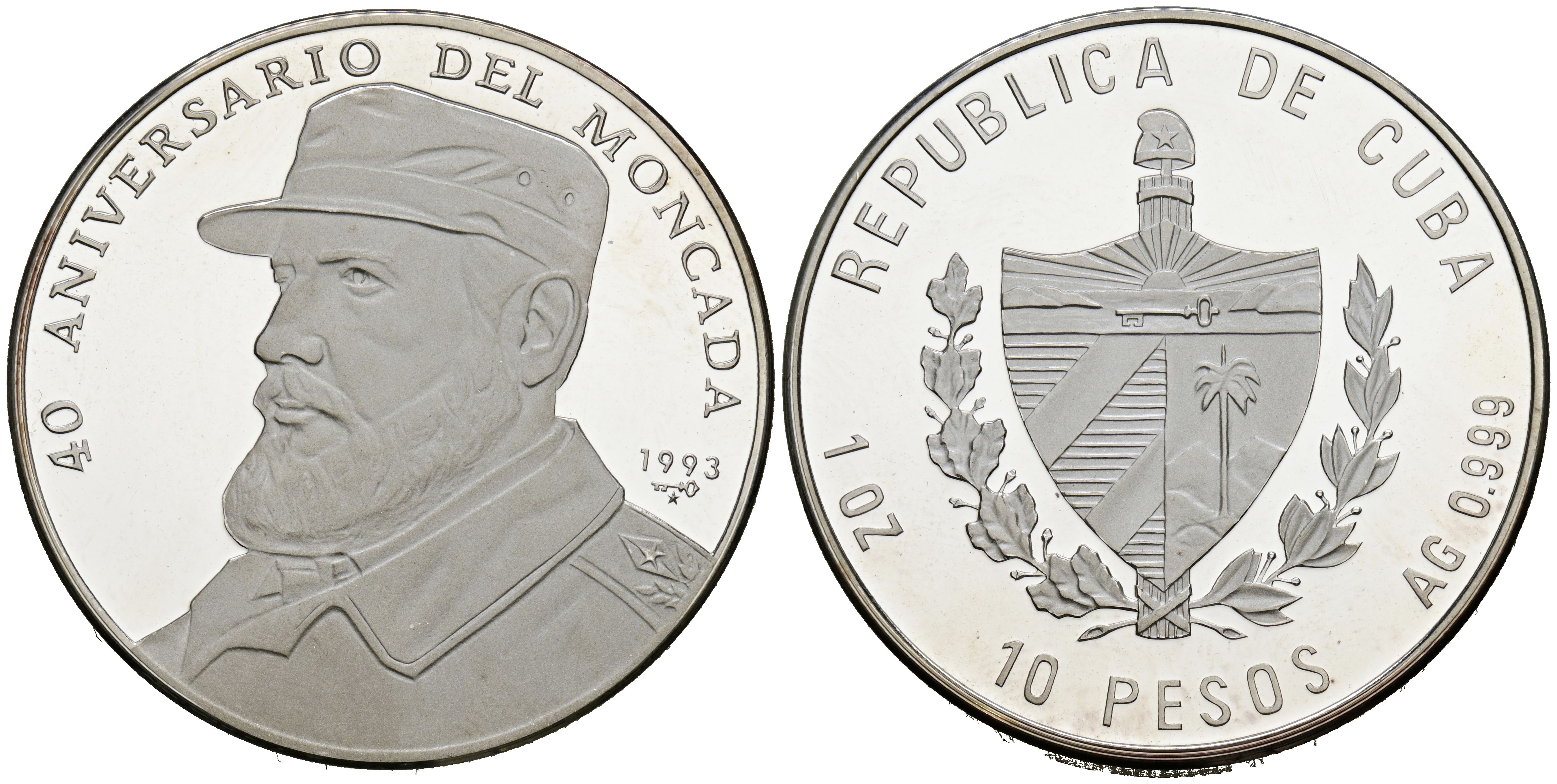 CUBA. 10 Pesos. (Ar. 31,11g/38mm). 1993. Fidel Castro. (Km#398). PROOF. Escasa.