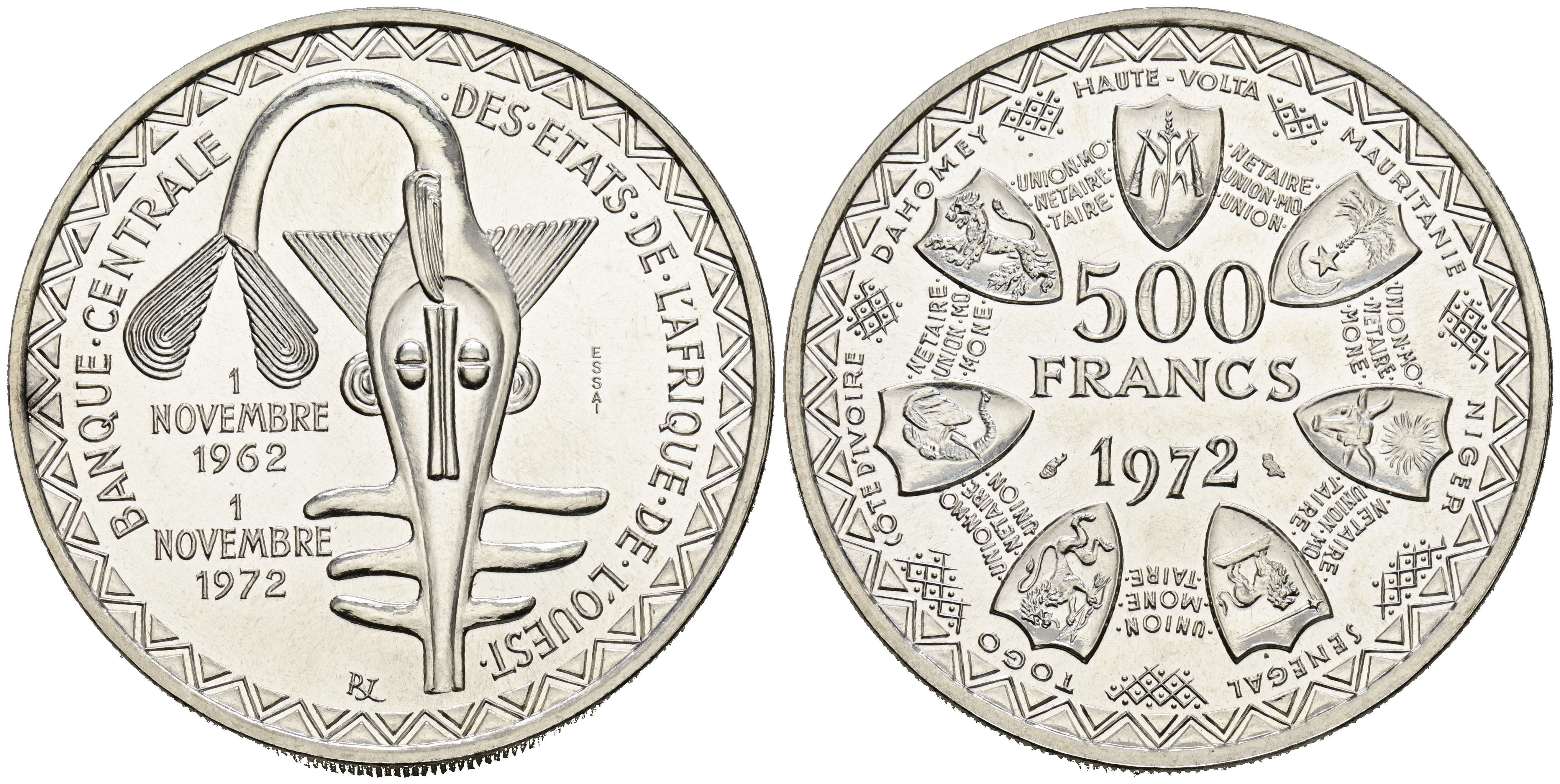 ESTADOS AFRICANOS DEL OESTE. 500 Francos (Ar. 24,97g/37mm). 1972. 10 Aniversario de la Unión Monetaria. (Km#7). SC. Leves rayitas de limpieza.
