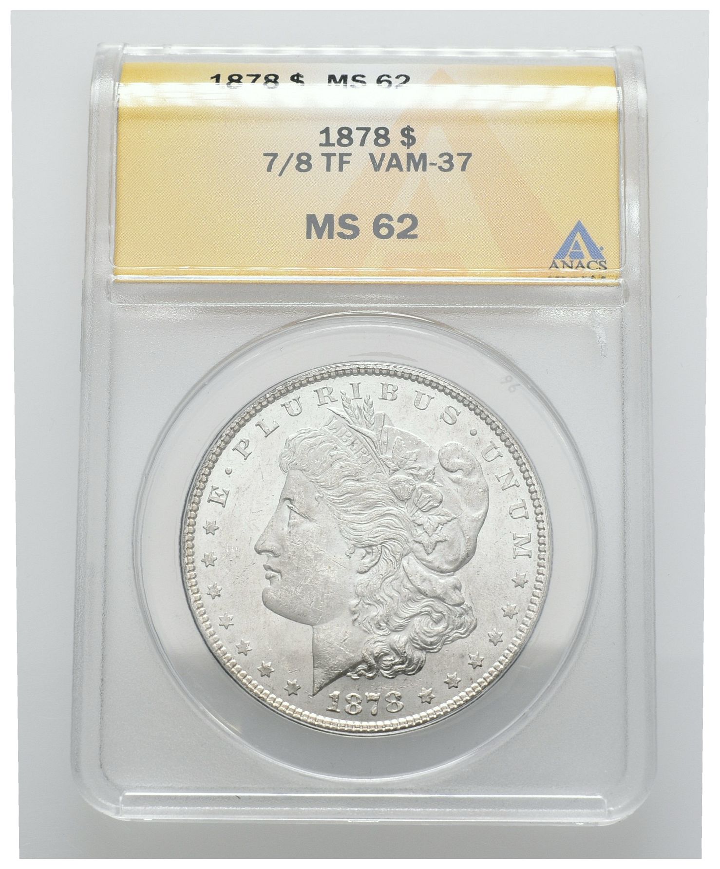 ESTADOS UNIDOS. 1 Dollar (Ar. 26,73g/38mm)*. 1878. Philadelphia. 7/8 TF. VAM-37. (Km#110). Encapsulado por ANACS MS62. *Peso y medida teórico.