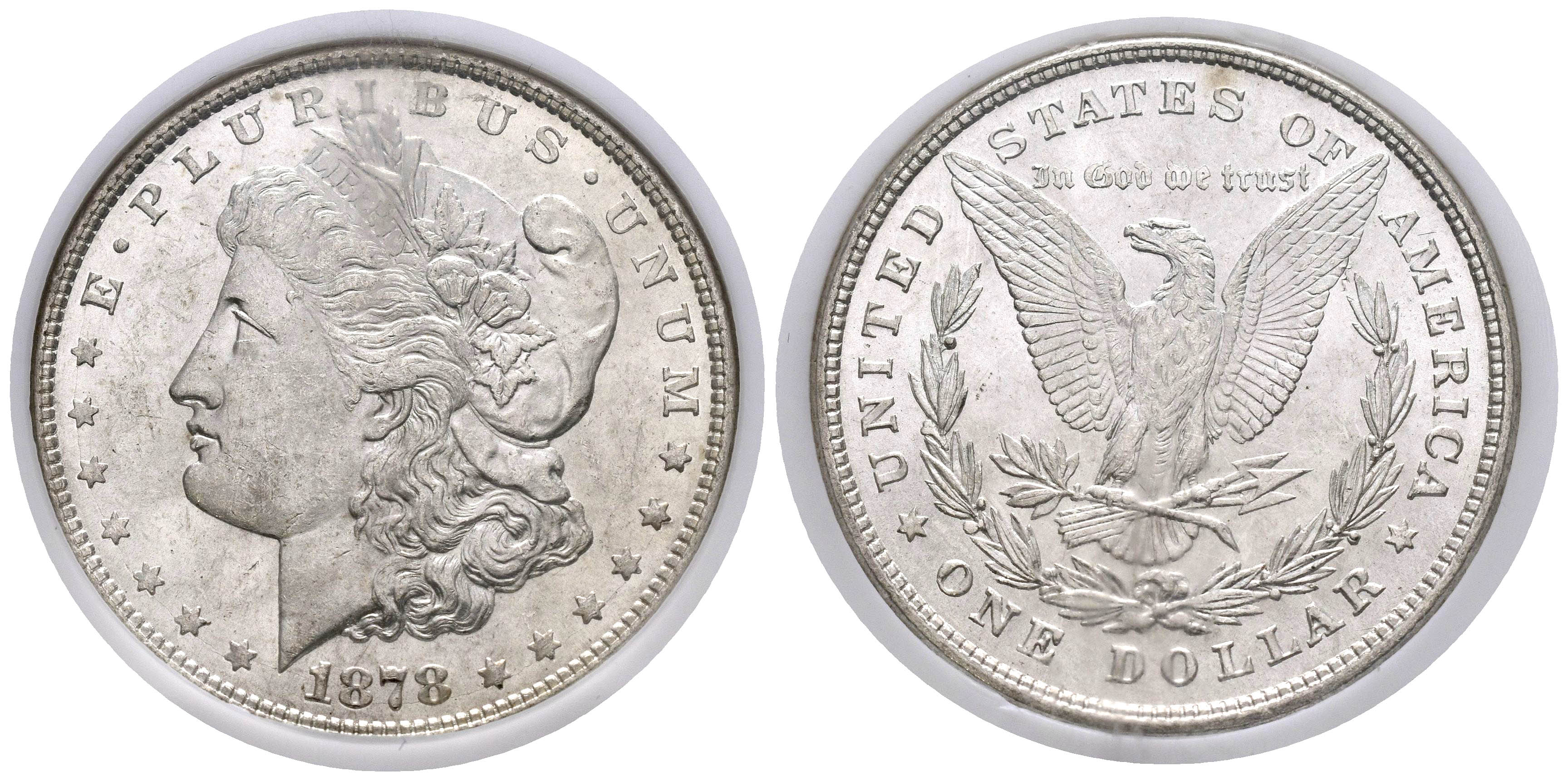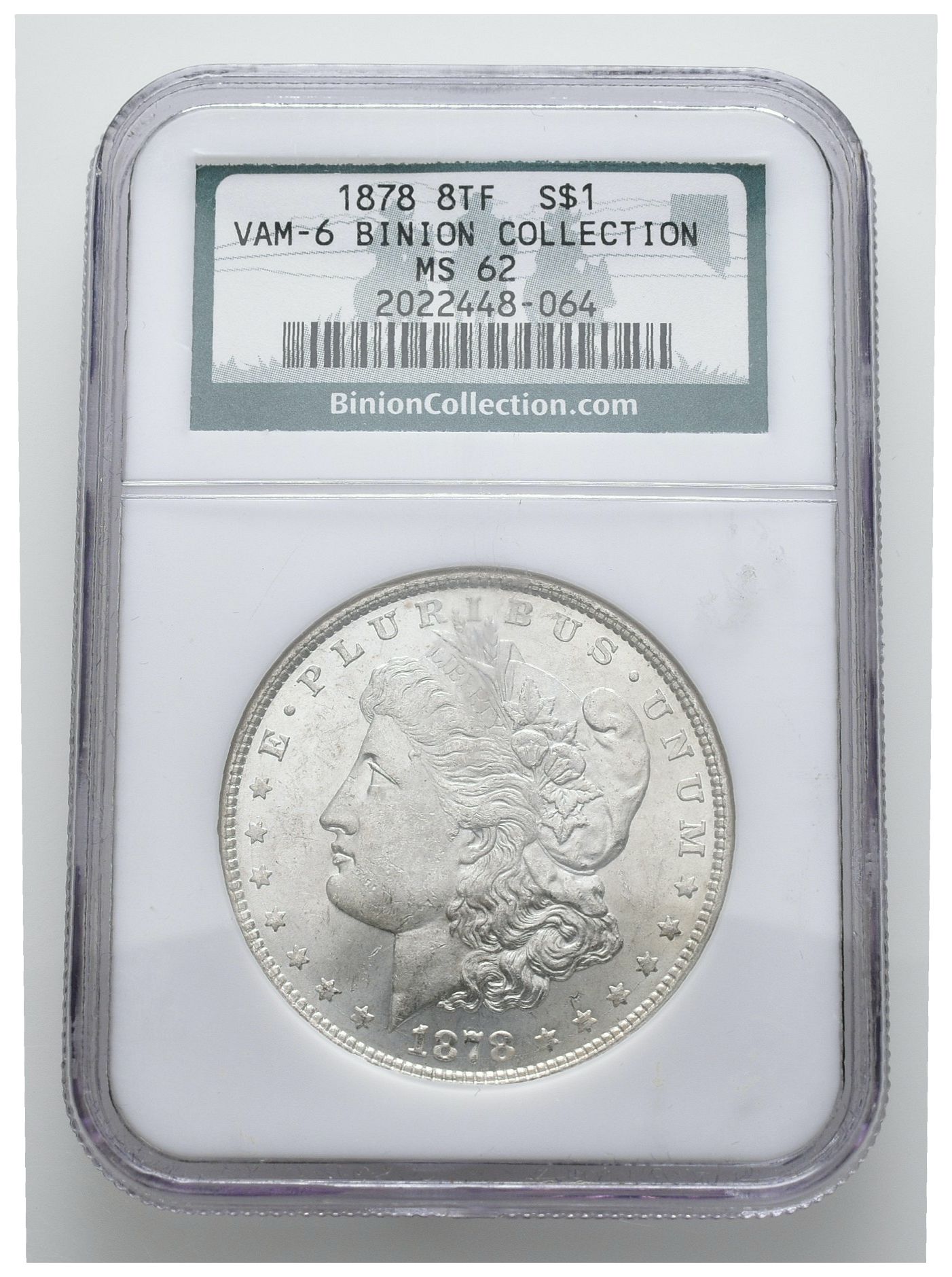 ESTADOS UNIDOS. 1 Dollar (Ar. 26,73g/38mm)*. 1878. Philadelphia. 8TF. VAM-6. (Km#110). Encapsulado por NGC MS62. *Peso y medida teórico.Ex Binion Collection.