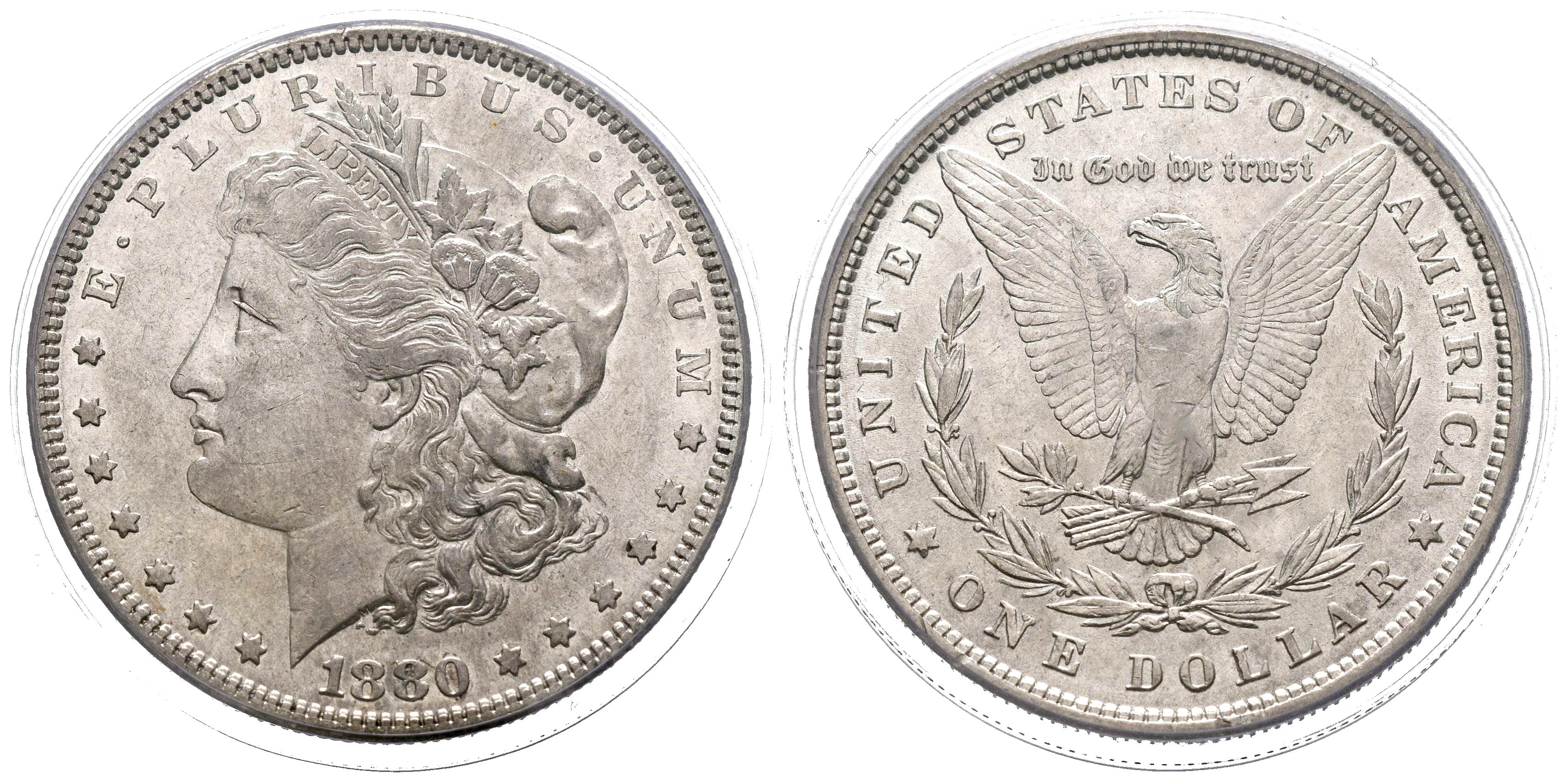 ESTADOS UNIDOS. 1 Dollar (Ar. 26,73g/38mm)*. 1880. Philadelphia. VAM-6 8/7 Spikes. TOP 100. (Km#110). Encapsulado por PCGS AU53. *Peso y medida teórico.