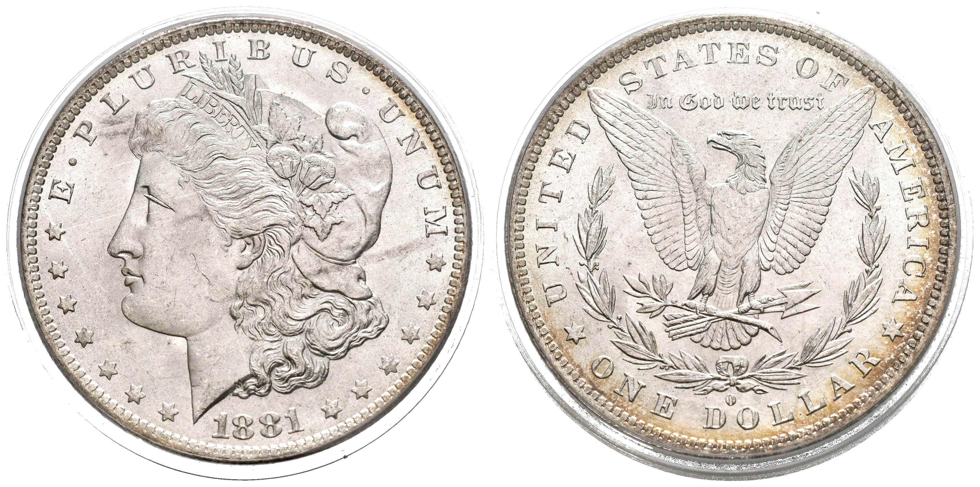 ESTADOS UNIDOS. 1 Dollar (Ar. 26,73g/38mm)*. 1881. Nueva Orleans O. (Km#110). Encapsulado por PCGS MS62. *Peso y medida teórico.