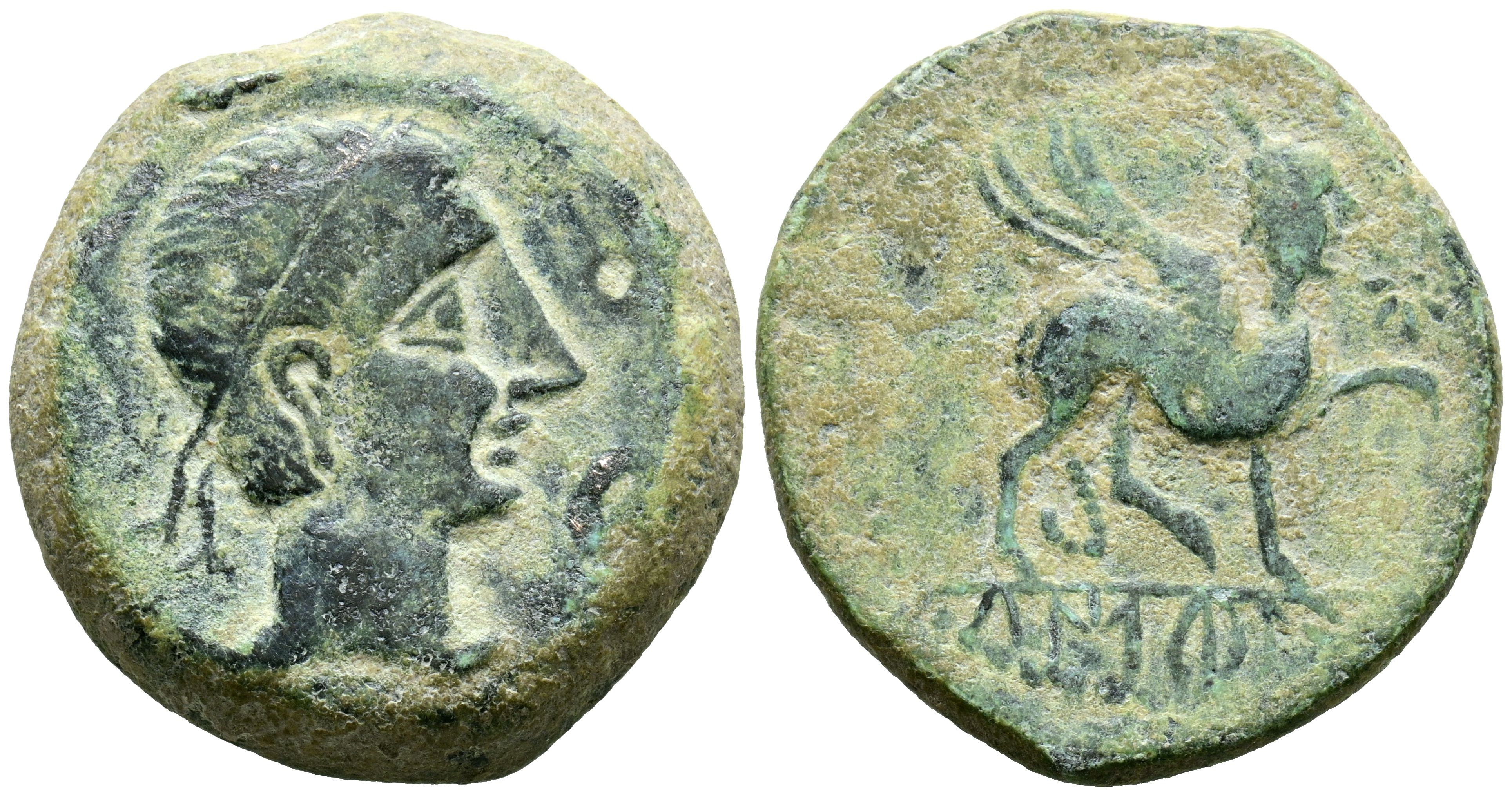 CASTULO (Cazlona, Jaén). As. (Ae. 16,65g/27mm). 180 a.C. (FAB-702). Anv: Cabeza masculina diademada a derecha, delante creciente. Rev: Esfinge a derecha, delante estrella, debajo leyenda ibérica: CaSTeLE. MBC+.